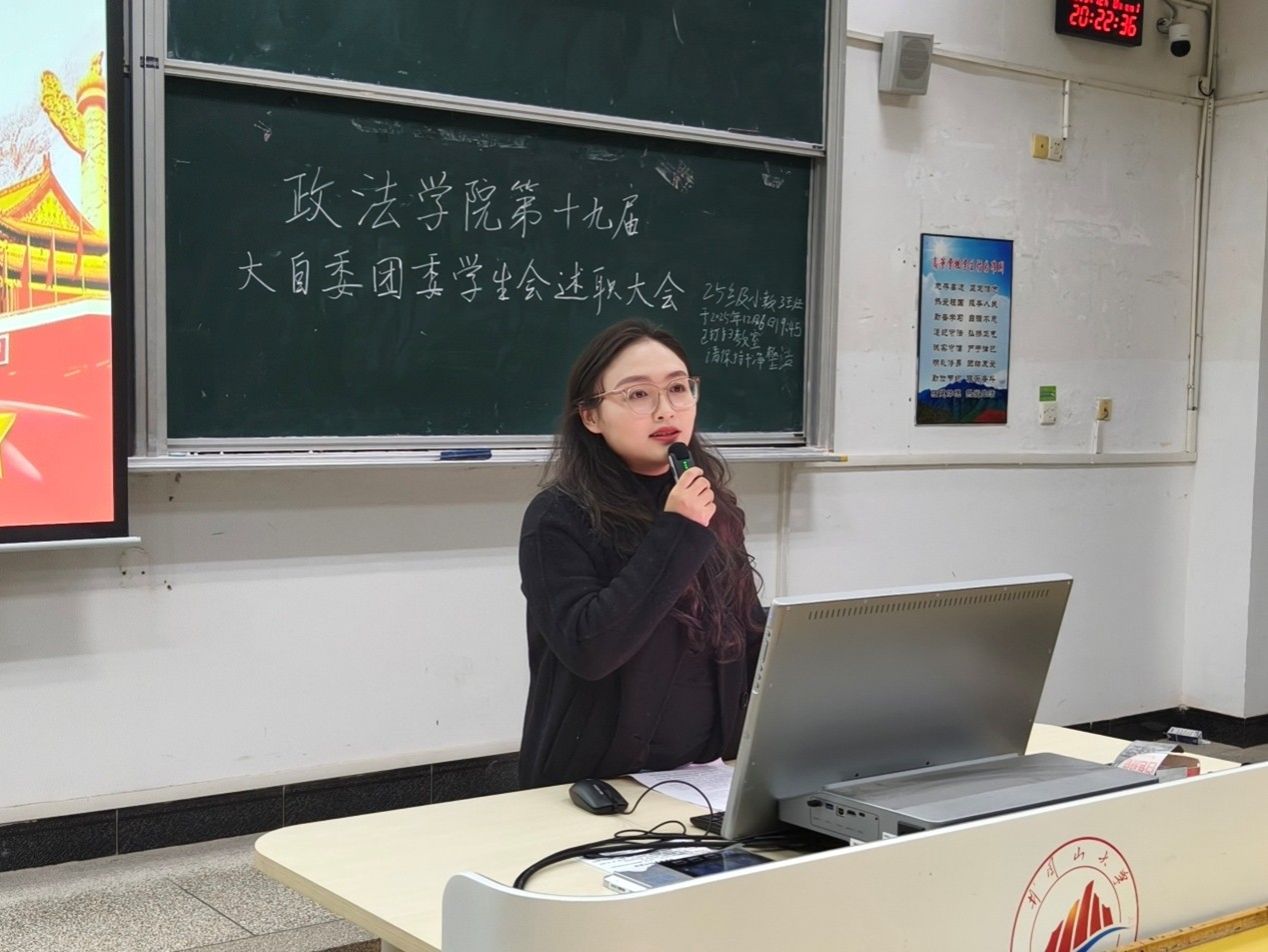 为进一步了解各部门的常态化工作内容与工作亮点、加强部门间沟通配合、全面总结全年工作,12月8日晚6时30分,政法学院于5栋308教室举行2025年度团委学生会述职评议会。政法学院团委副书记、学生科副科长肖文海,专职辅导员欧阳蓓,研究生辅导员助理林福琴、周玟应邀出席,第十九届大自委团委学生会全体成员参加。