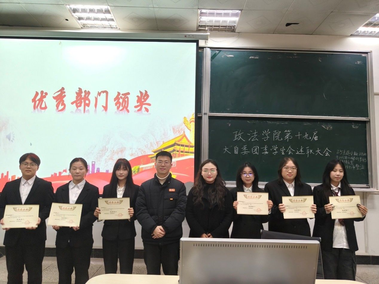 会上,政法学院第十九届学生会执行主席顾雅轩全面汇报了在思想引领、权益服务、文体活动等方面的工作成效、现存问题和未来规划。随后,各部门负责人依次上台,围绕本部门年度核心职责、重点工作完成情况、创新举措及存在问题进行汇报。汇报内容聚焦实际,数据详实,既展示了在思想引领、学风促进、权益服务、校园文化等方面取得的扎实成果,也直面工作中遇到的挑战与反思。述职结束后,欧阳蓓肯定了2025年度团委学生会工作成效,并面向全体学生骨干提出四点期望:一是坚定理想信念,传承红色基因,永葆服务初心;二是紧跟时代发展,勇于创新实践,深化工作品牌建设;三是锤炼严谨作风,提升综合能力,平衡学业工作;四是加强团队协同,聚焦同学需求,规范高效运营。讲话为学生组织未来工作指明了方向,注入了动力。结合各部门述职表现与日常工作成效,经过现场评选,大自委督察部、团委就业服务部、综合素质拓展部、组织部和学生会学习部、学生权益服务部被评为“优秀部门”。