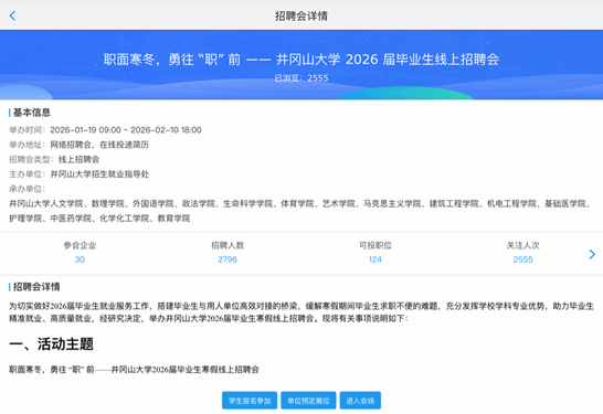 寒假期间,为帮助毕业生解决求职不便问题,扎实推进政法学院2026届毕业生就业服务工作,政法学院开展了寒假线上暖心促就业活动,旨在搭建毕业生与用人单位高效对接的平台,助力毕业生实现高质量就业。