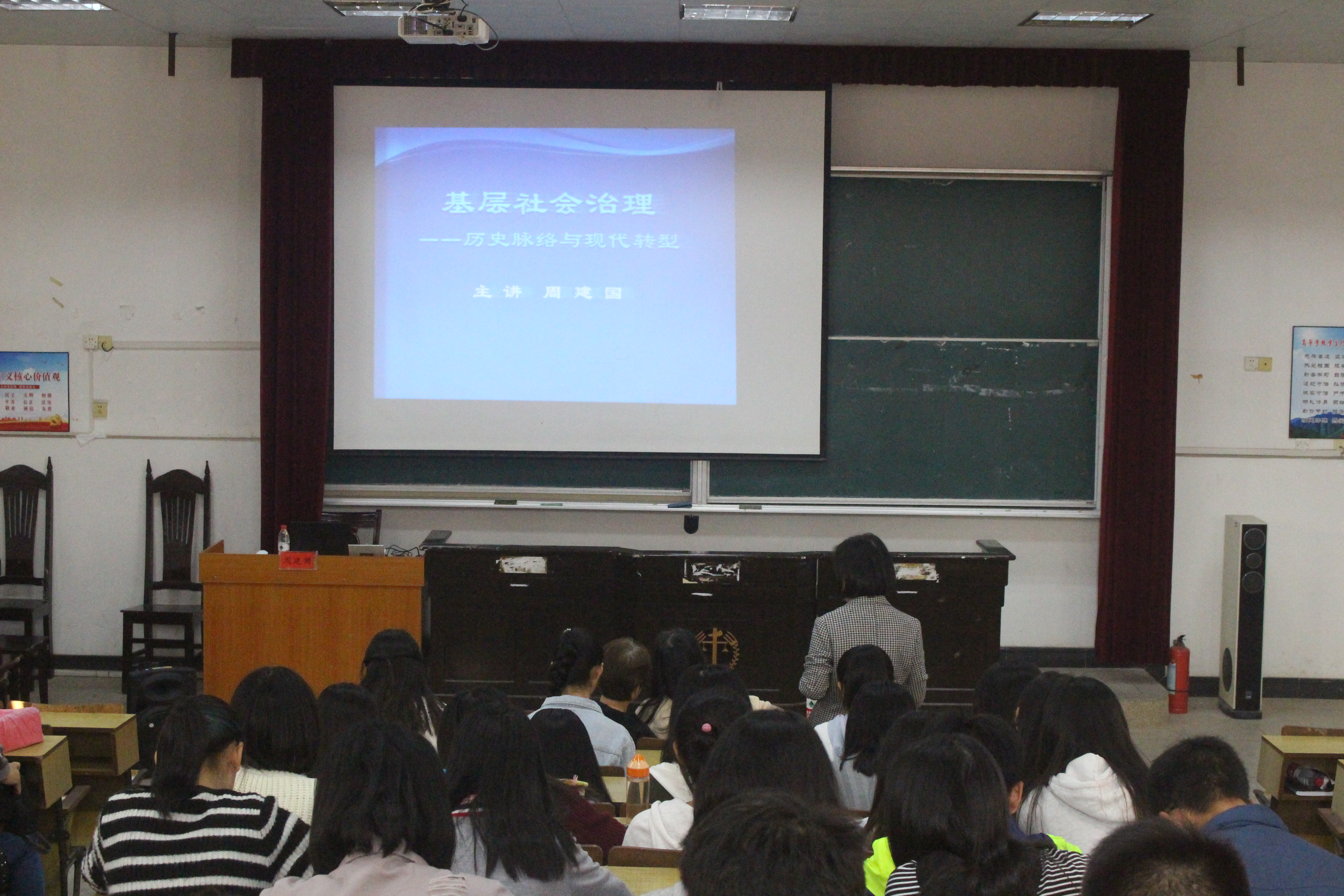 在井冈山大学更名10周年暨建校59周年校庆之际,10月29日上午9时,应政法学院邀请,上海交大教授周建国于5栋408教室作题为“基层社会治理”的学术讲座。政法学院院长仰和芝、社会工作硕士点老师赵玲玲、刘晓丽出席讲座。 讲座上,周教授用“社会存在什么着问题?”“什么是社区?”两个问题引出话题,介绍了中国传统社会治理结构和计划体制下社会治理结构两大模型。从行政全能主义国家是如何形成的、后单位时代基层政治中出现的问题、社会发展出现的两种属性、异质或多元化社会治理的路径选择等方面为老师和同学们一一进行了讲解。