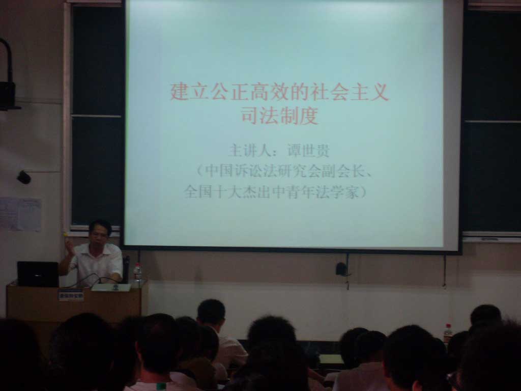 2009年9月19日,原海南大学校长,中国刑事诉讼法学会副会长,浙江工商大学诉讼法研究所所长,全国十大杰出中青年法学家谭世贵教授,作客“庐陵法律大讲堂”,在5-308教室为全校师生作了一场生动精彩的报告:《建设公正、高效、权威的社会主义司法制度》。