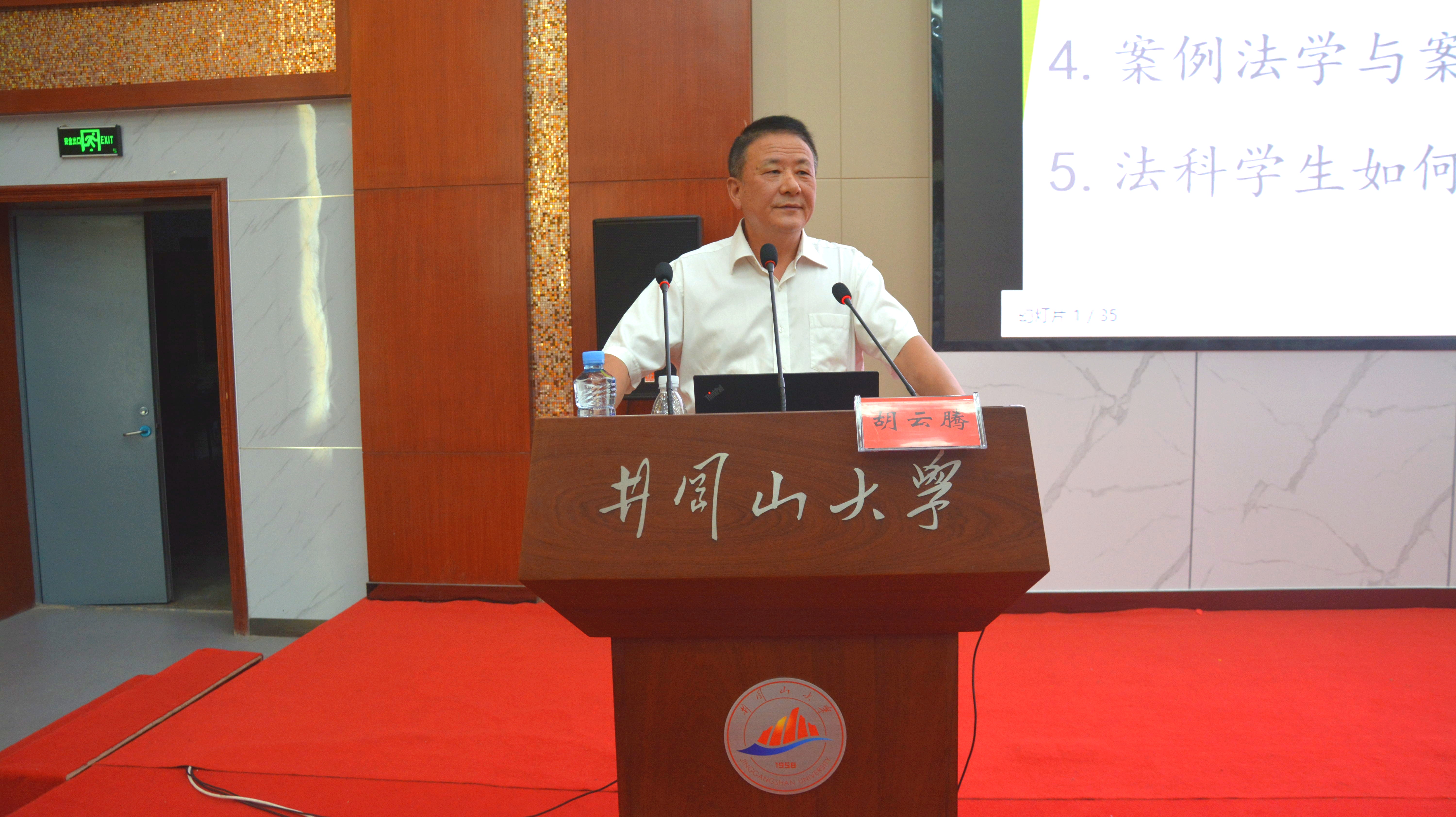 5月28日晚7时整,中国案例法学研究会会长(原最高人民法院原审判委员会副部级专职委员、第二巡回法庭庭长)胡云腾教授到访井冈山大学政法学院,于北区新图书馆北附楼一楼报告厅开展主题为“案例法学与案例法治的若干问题”的学术讲座。本次学术讲座由井冈山大学政法学院副院长欧阳晓安主持,特邀吉安市公检法部分人员和实践实习律所单位代表旁听,政法学院两百余名师生参加此次讲座。