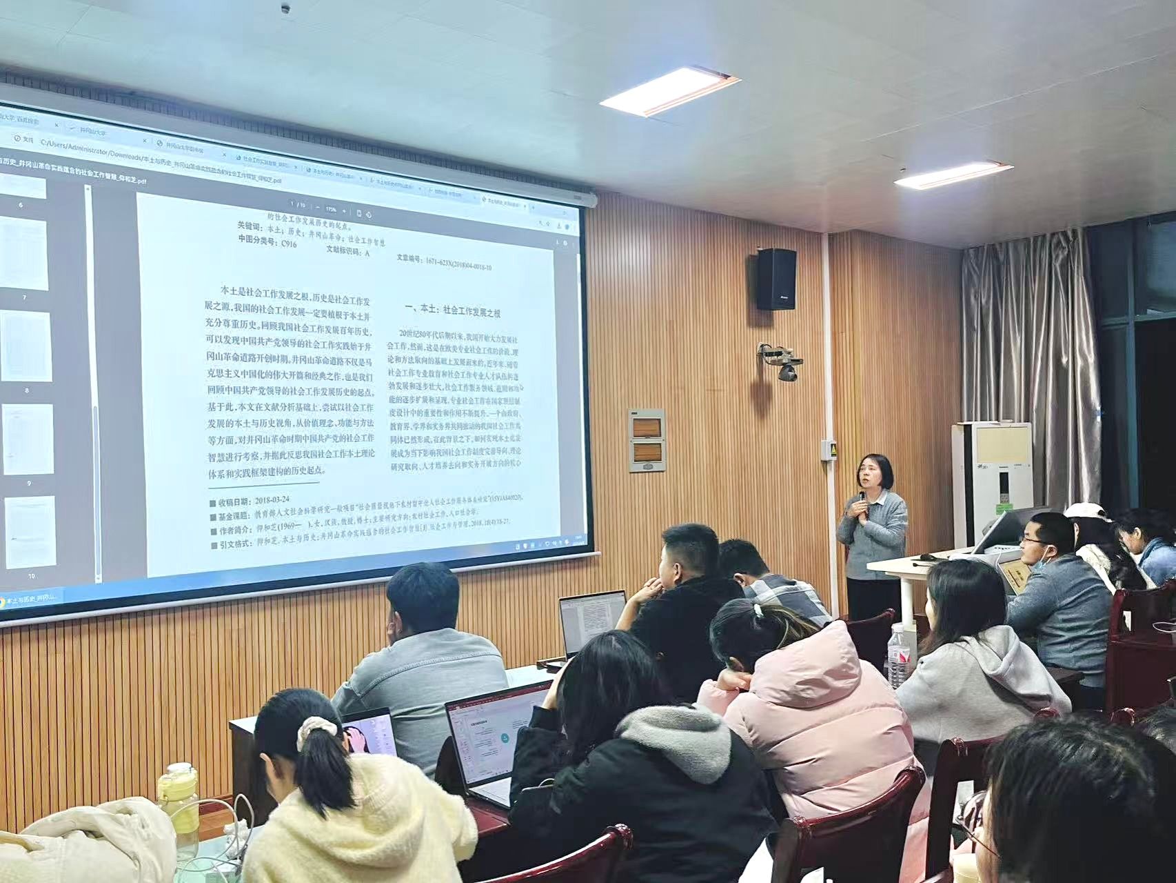 讲学伊始,仰和芝老师着重强调了本土对于社会工作的重要意义,并指出我国社会工作并非无根之木,而是深深扎根于本土文化与历史土壤之中。井冈山革命时期,中国共产党在艰苦卓绝的斗争中展现出的卓越社会工作智慧,是我国社会工作本土化的历史瑰宝,为当代社会工作发展提供了弥足珍贵的经验。随后,仰和芝老师深入剖析了我国社会工作本土化进程中面临的问题,以及梳理了学界有关社会工作本土化的观点。其次,仰和芝老师着重阐述了我国社会工作发展的重要任务,指出需要植根于我国本土社会工作的历史脉络,挖掘其中蕴含的理论资源和实践智慧。最后仰和芝老师认为社会工作的真正动力在于发现和满足服务对象的需求,这与井冈山革命时期把群众现实需求和利益作为出发点的斗争理念高度契合。这一历史经验启示当代社会工作者,要始终坚持以人民为中心,关注服务对象的需求,才能真正发挥社会工作的价值。