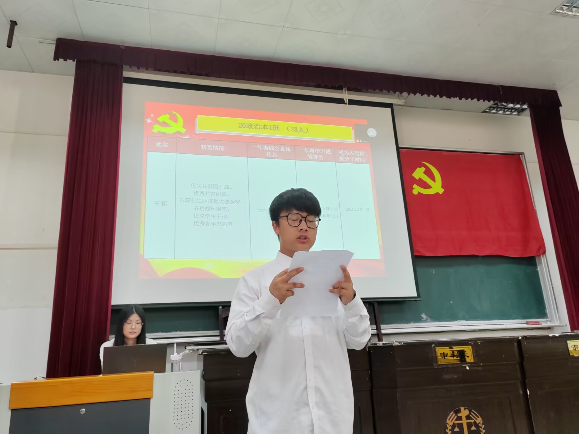 会议以讨论能否接收王朝等14人成为预备党员为主要内容,会上严格按照发展党员程序进行。发展对象依次向党组织汇报考察期内的学习、工作、生活、思想等情况,入党介绍人介绍发展对象有关情况并表明态度,支部委员会报告发展对象审查情况,党内同志认真倾听,并发表意见。正式党员进行投票表决,14名发展对象全票通过,大会正式接收王朝、刘俊、张凌轩、胡佳丽、张应露、张紫乐、蔡越、蔡浚祎、张雪、张文海、王家琦、钟宇、刘思悦、刘卓钰14名同志为中共预备党员。