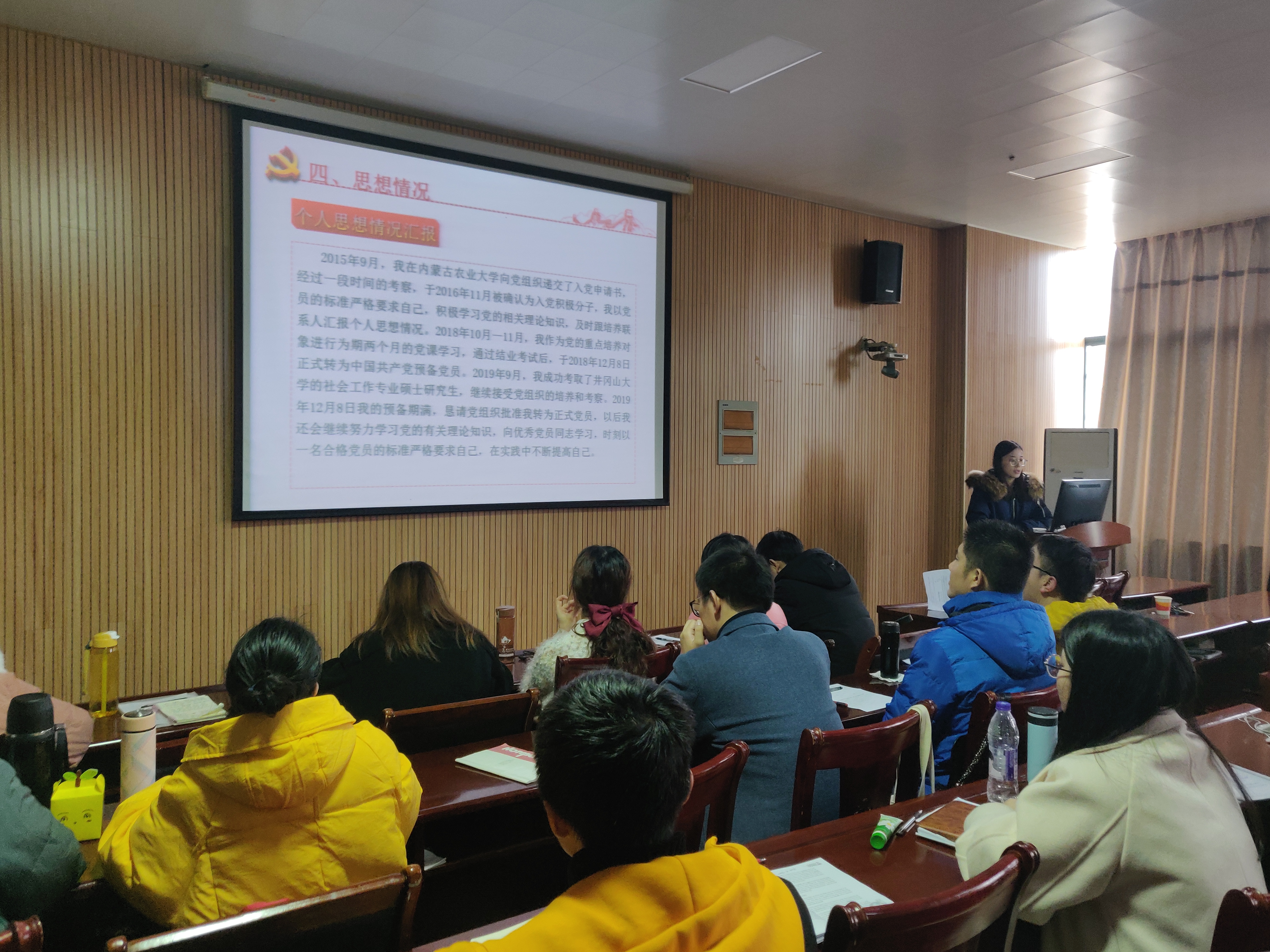 2019年12月25日中午12时30分,井冈山大学研究生党支部召开预备党员转正支部大会,大会讨论关于19级社会工作研究生专硕班吕怡楠和张晶山2名同志申请转为正式党员。会议由党支部书记郑慧玲主持,组织委员胡贝潇同志进行人数清点,并宣布党员到会情况。随后大会正式开始。