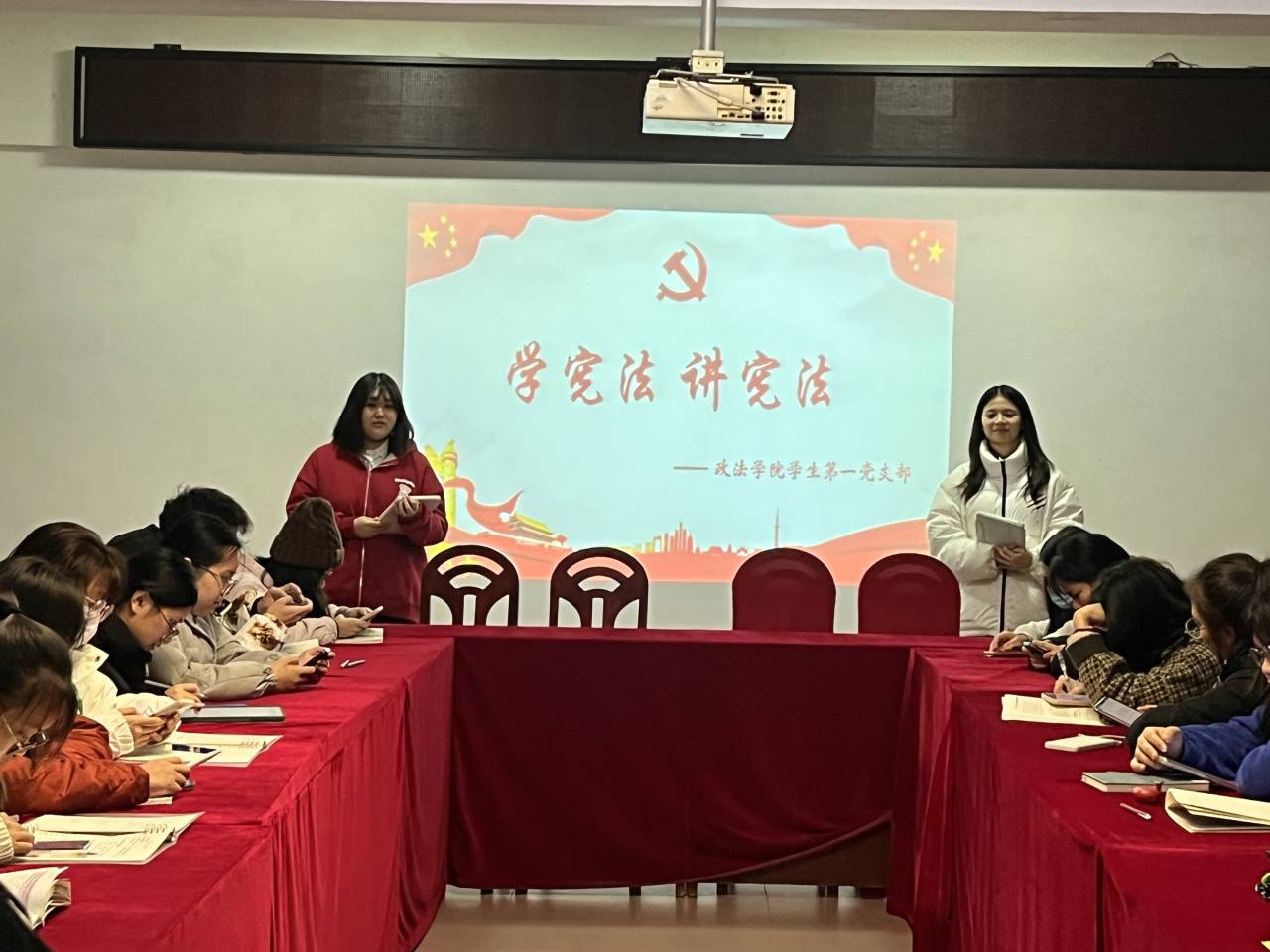 为深入学习贯彻习近平法治思想,提高全体师生法治意识,引导学生深入了解宪法、尊崇宪法,推动校园法治文化建设。2022年12月5日晚上6点,政法学院学生第一党支部举行了“学宪法 讲宪法”线下学习活动,支部部分党员、入党积极分子参与本次活动。 活动中,徐铷杉、刘欣同志就学宪法的意义进行了宣讲,充分调动广大同学习宪法的积极性,随后组织同学们观看“40年,她守护着我们的美好生活——纪念我国现行宪法公布施行四十周年”视频,增强了同学们的宪法观念,激励了他们忠于和维护宪法的决心,同时也很大程度地提高了同学们宪法意识和法治理念。