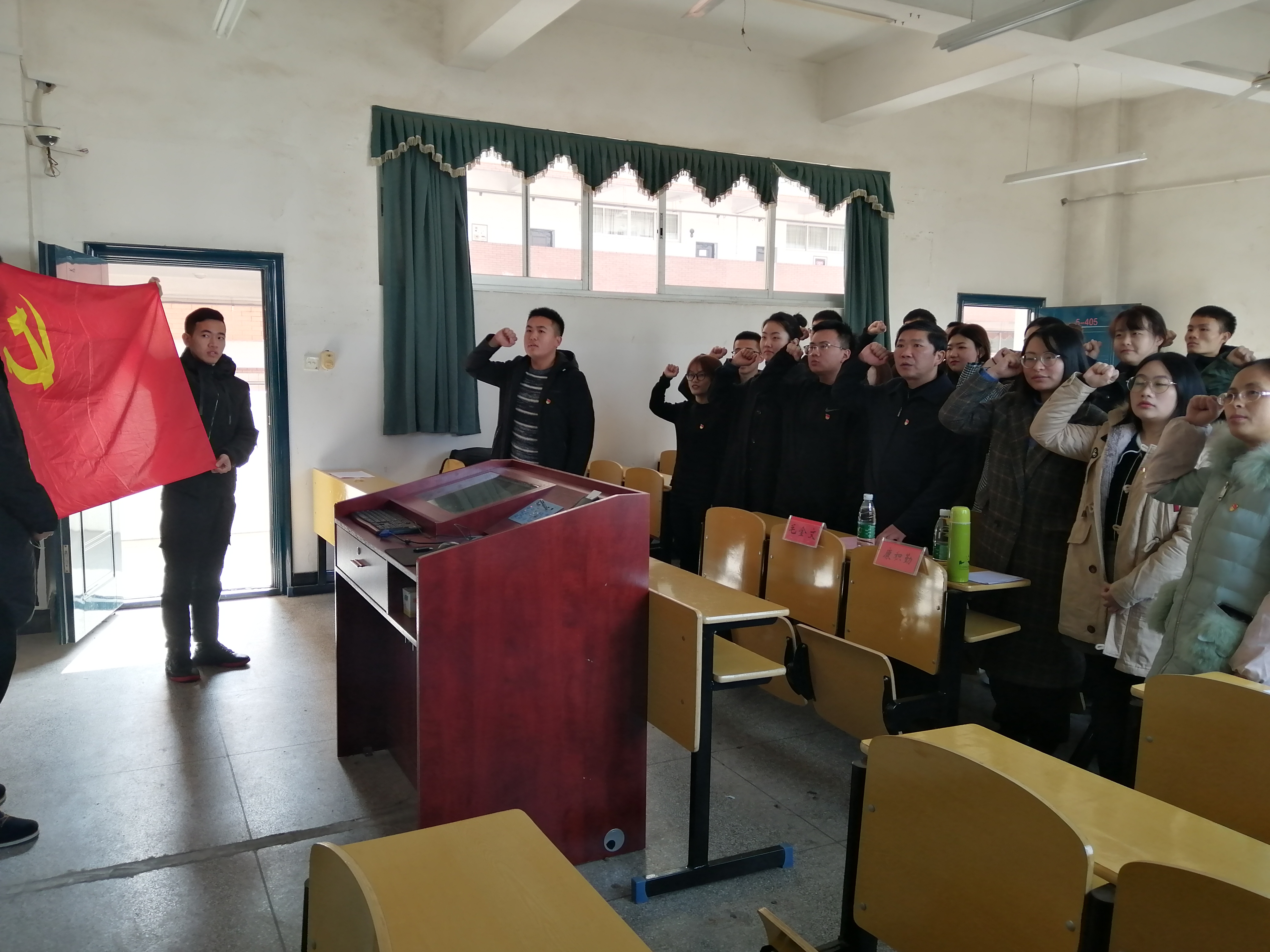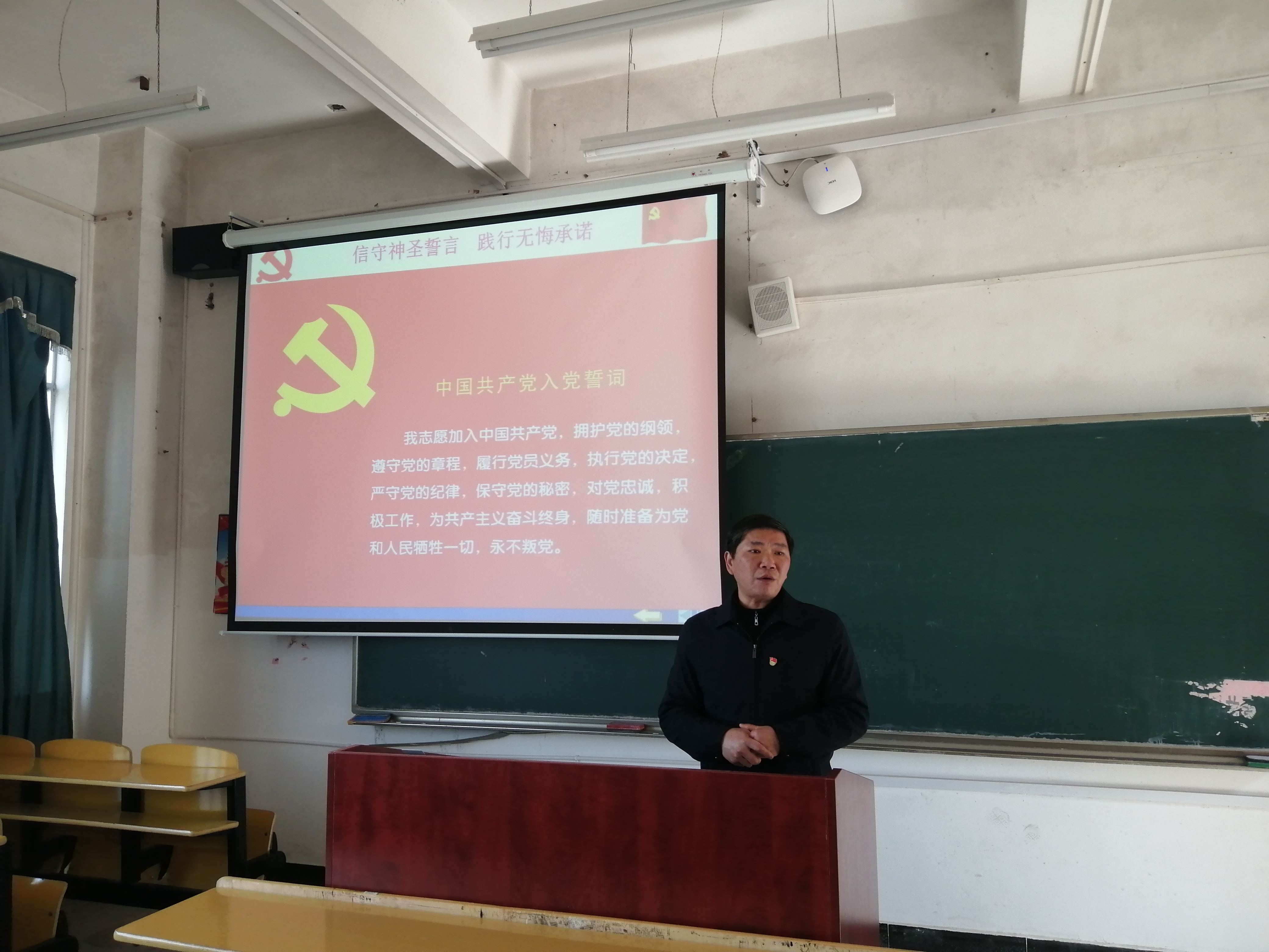 会议伊始,党委组织员宣布仪式开始,全体起立,奏国际歌。结束后宣读了参加宣誓的预备党员名单。接着,由时振滔同志领读誓词宣誓,全体成员列队肃立,面对党旗进行跟读。而后毛金文为大家作"信守神圣誓言,践行无悔承诺"的总结讲话,带领大家认识学习了入党誓词的起源和历史演变和新时期入党誓词的深刻内涵。告诉大家践行入党誓词是共产党员的责任和使命,共产党员信守入党誓词必须一诺千金、终身无悔并且要积极践行无悔承诺,作为大学生党员就是要发挥先锋模范带头作用。重点提出大家从先进青年到中国共产党党员的身份的转变后自然要始终牢记誓词,遵守党员准则。