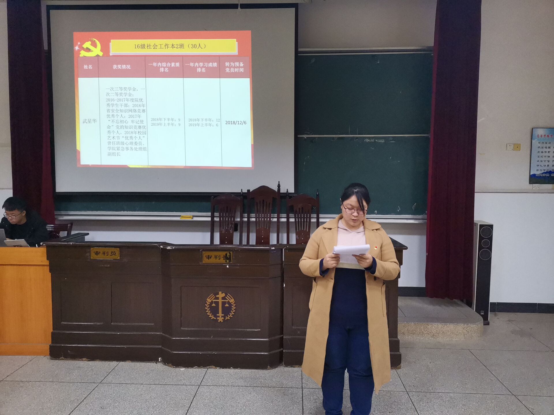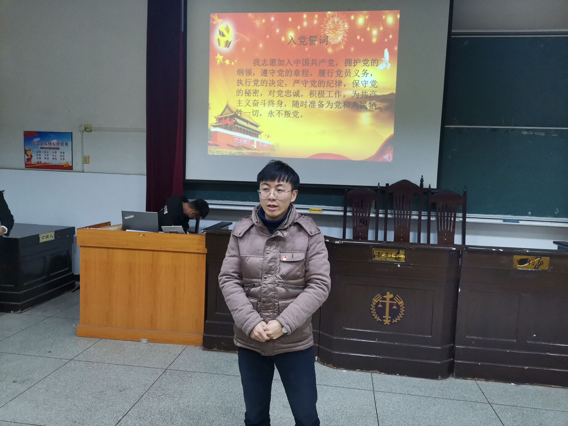2019年12月16日晚,政法学院学生第二党支部于5栋408教室顺利召开转正接收大会,学生第二党支部书记肖文海出席,支部党员、预备党员到场参与。