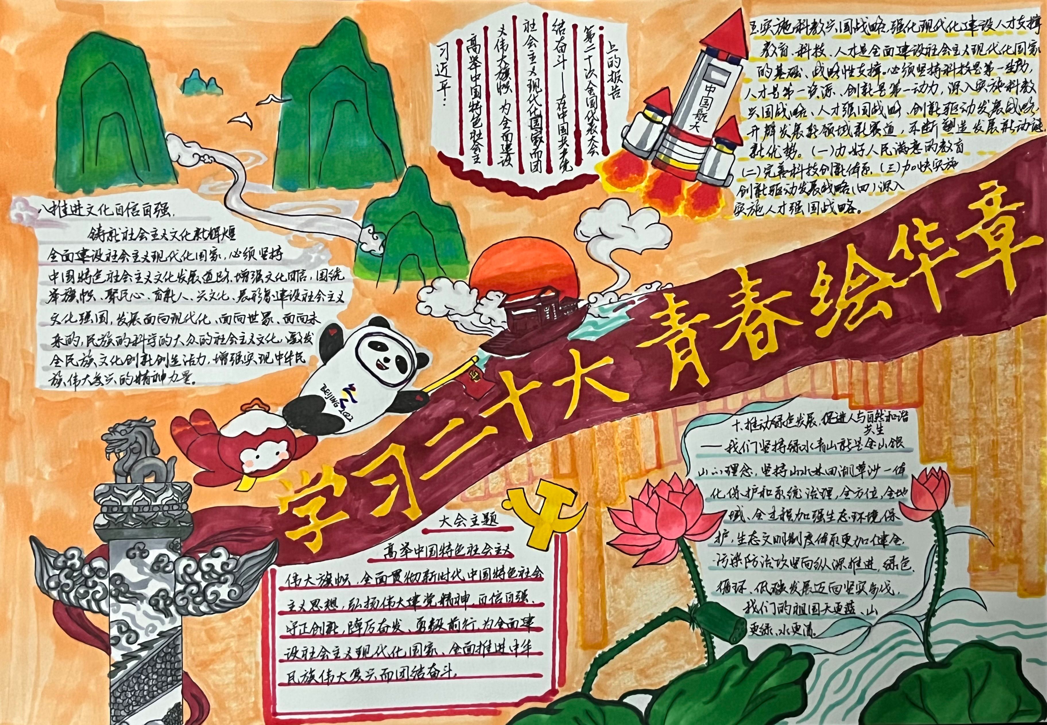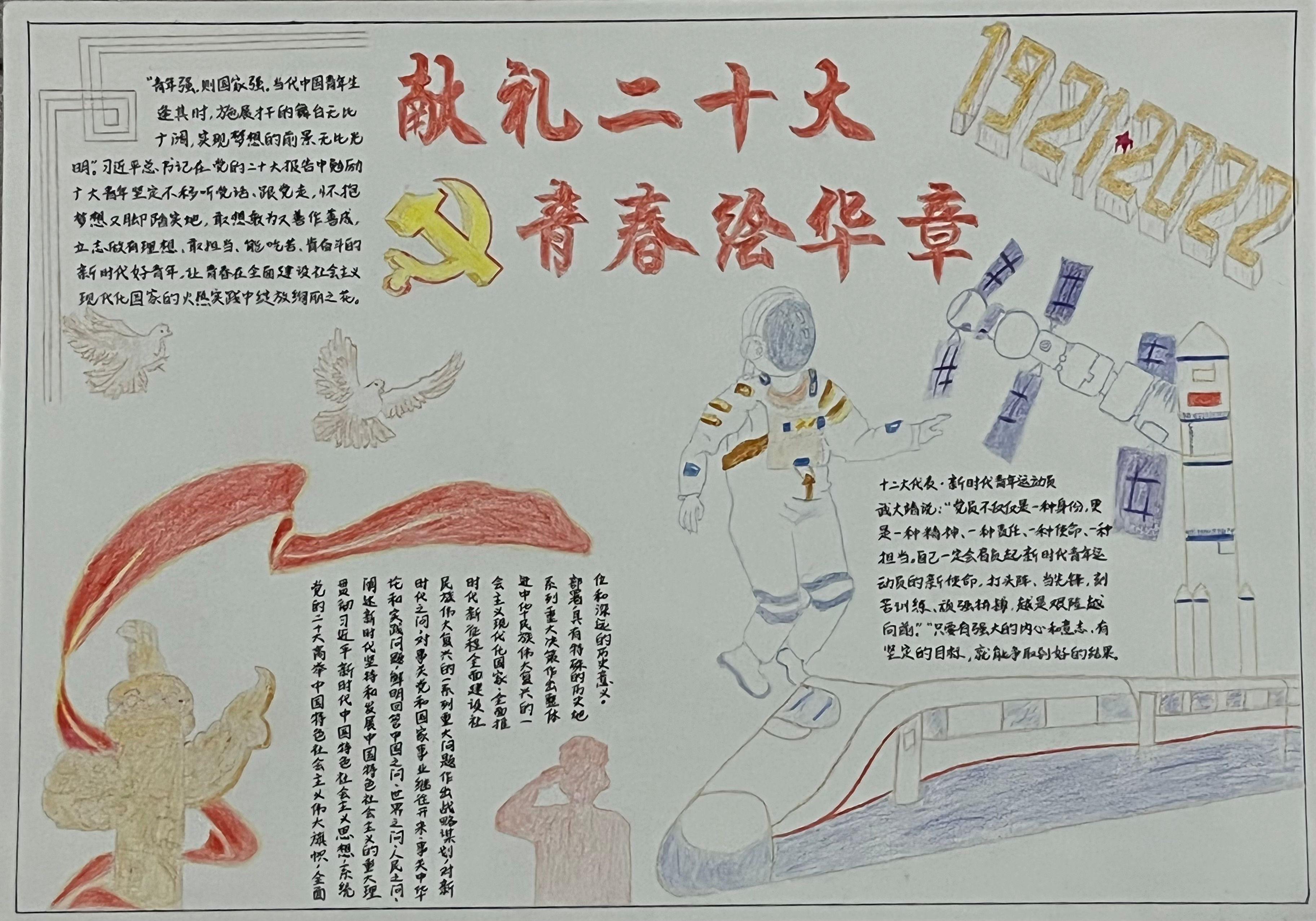以青春之名,绘写华章;以心中红星,献礼中华。小小手抄报,浓浓爱国情。通过本次活动,进一步引导大家学习党的二十大精神,坚定不移听党话、跟党走,怀抱梦想又脚踏实地,敢想敢为又善作善成,立志做有理想、敢担当、能吃苦、肯奋斗的新时代好青年。(图|文,政法学院学生第一党支部)