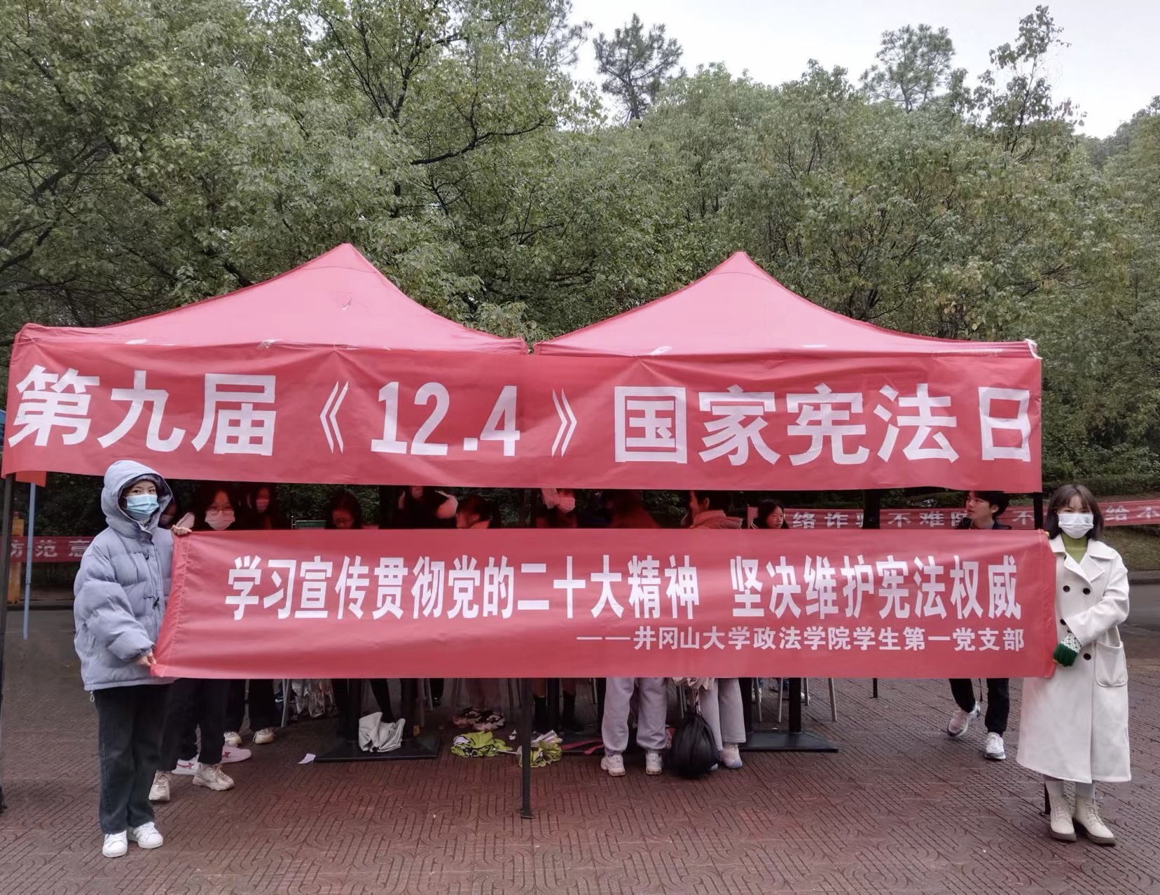在我国现行宪法施行四十周年之际,为深入学习宣传习近平法治思想,大力弘扬宪法精神,连日来,井冈山大学政法学院学生第一党支部以“学习宣传贯彻党的二十大精神 坚决维护宪法权威”为主题,充分发挥“法律之舟”的品牌特色,开展系列宪法学习宣传活动。 组织宪法晨读活动