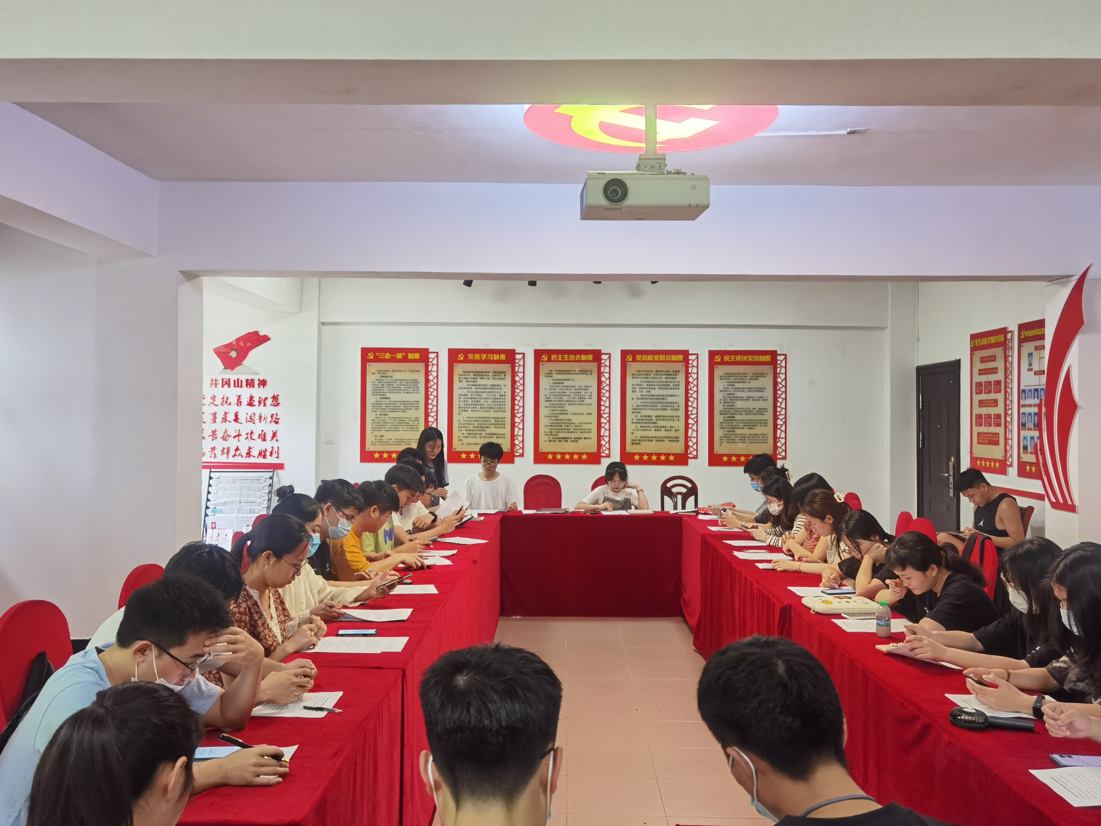 为进一步增强疫情防控意识,强化党员责任担当,传递战“疫”信心。2022年4月28日13点50分,政法学院学生第一党支部在19栋党员会议室召开“发挥战斗堡垒和先锋模范作用,在抗疫中彰显组织优势和党员本色——持续贯彻落实党的十九届六中全会精神和省第十五次党代会精神”主题党日活动。