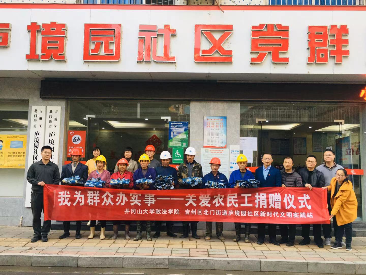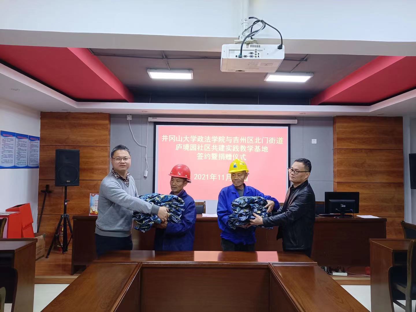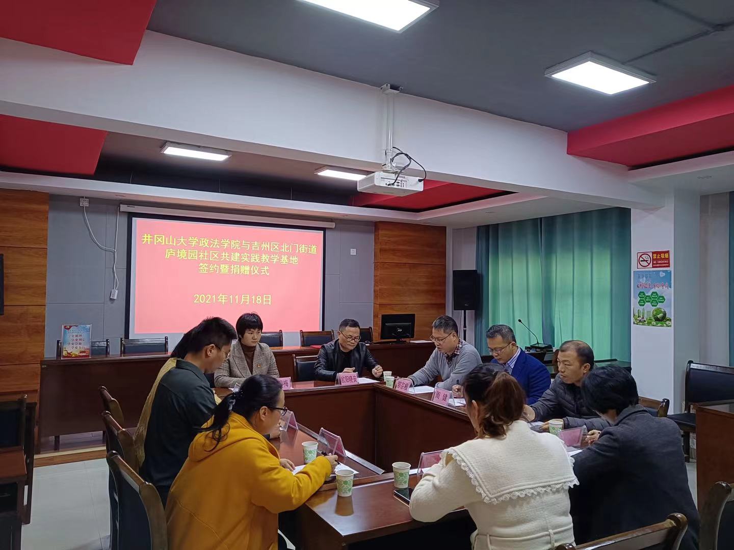 11月18日下午,井冈山大学政法学院和庐境园社区共建教学科研实践基地暨物资捐赠仪式在庐境园社区会议室举行。井冈山大学政法学院副院长欧阳晓安、邹宗根,北门街道司法所所长蔡樱、组织干事刘振锋,庐境园社区党委书记郭迎梅,井冈山大学教工第二党支部党员和庐境园社区工作人员共同参加了签字和捐赠仪式。教学科研实践基地建设是落实井冈山大学与吉安市校地合作协议和深化党建联盟的具体举措,有利于提高基层社区的治理水平,也有助于提高高等教育人才培养质量。物资捐赠是落实党建结对共建和推进党史学习教育为群众办实事的具体举措,将关爱群众的工作落到实处。校地双方还就进一步加强党建合作,共同探索社区治理创新,推进社会工作持证人才培养和法律明白人培训等工作进行了深入的交流。
