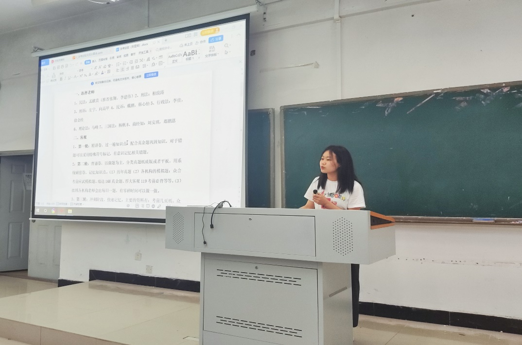 为帮助同学们明晰法考形势,了解备考过程,2023年5月6日晚上,政法学院学生第一党支部在10栋A015开展法考经验分享会活动,特邀请10位具有丰富法考备考经验的19级毕业生,为同学们答疑解惑。