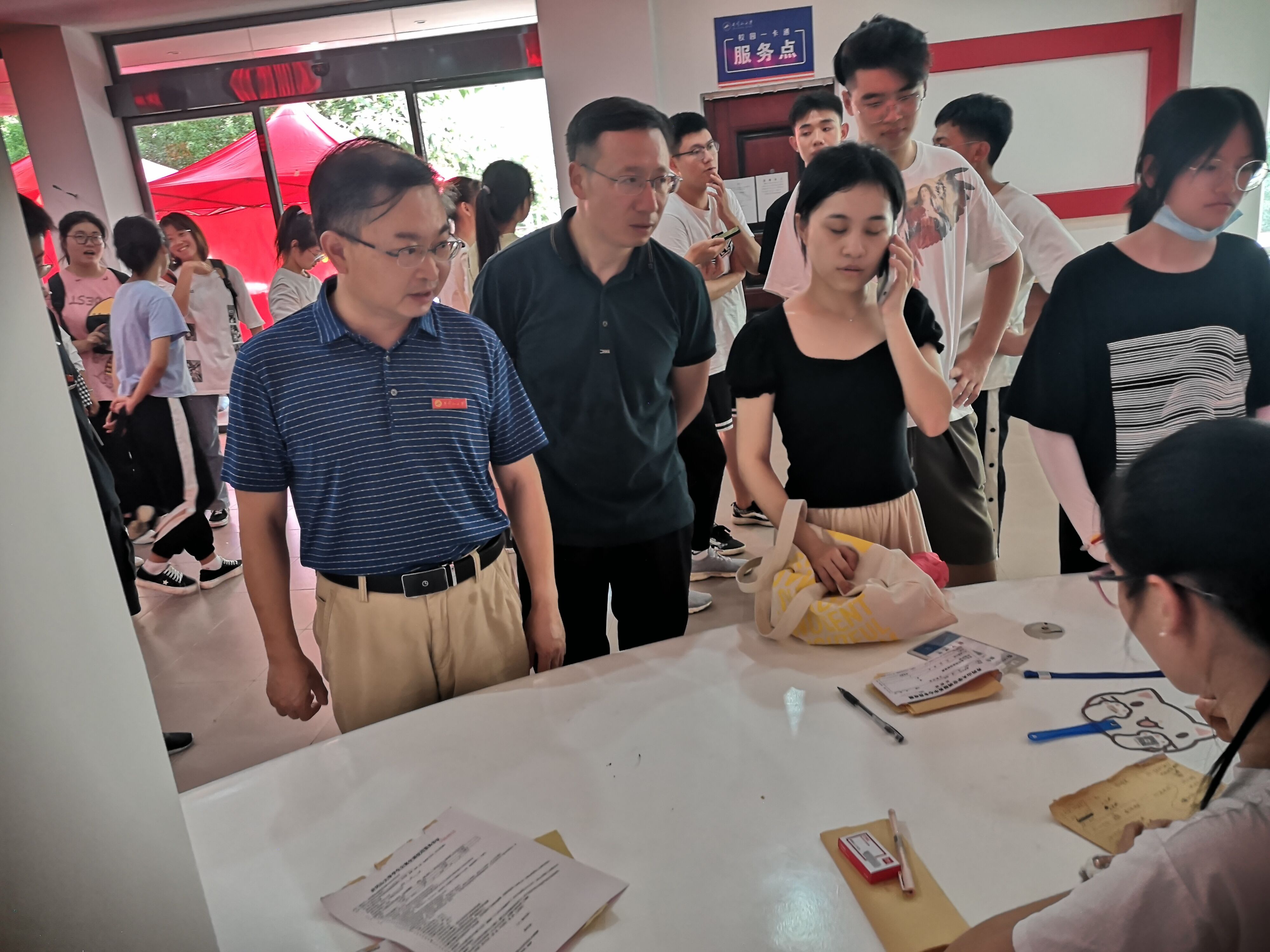 随后校长来到19栋办事服务大厅,对空调租赁、银行卡激活、新生课本分发等方面的情况进行了询问,针对新生的课程教材等方面的问题也进行了了解。