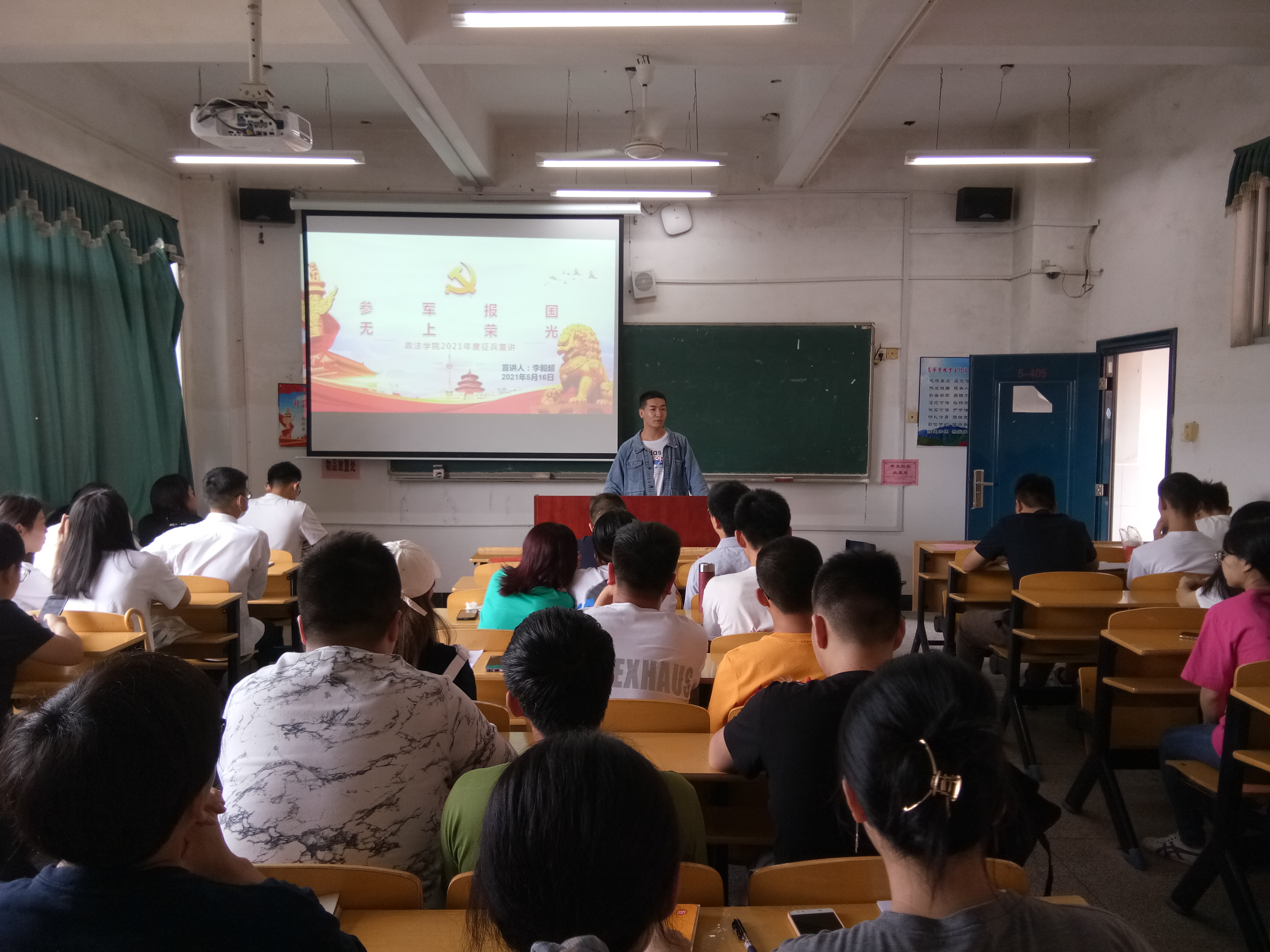 为做好新形势下征兵工作,加强国防和军队现代化建设。5月16日上午11时,政法学院于5栋405室举行以“参军报国,无上荣光”为题的征兵宣讲会。学院党委书记吴高平,辅导员康积勤、肖文海出席,我院退役士兵代表李毅超作宣讲报告,17级毕业班学生参加。