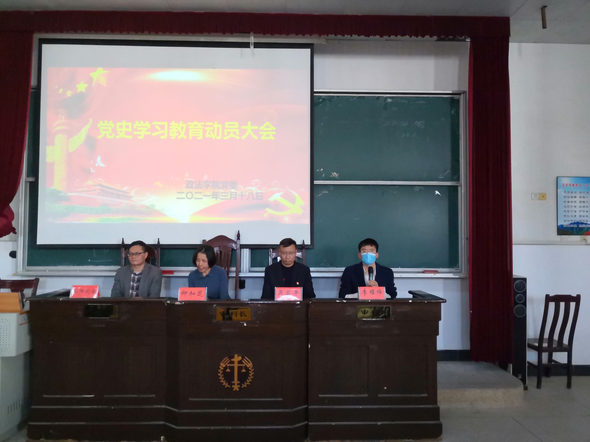 3月18日下午,政法学院党委于5栋408室召开党史学习教育动员大会,会议由学院副院长李耀锋主持,党委书记吴高平做动员大会讲话,学院处级领导干部和全体师生党员参加。