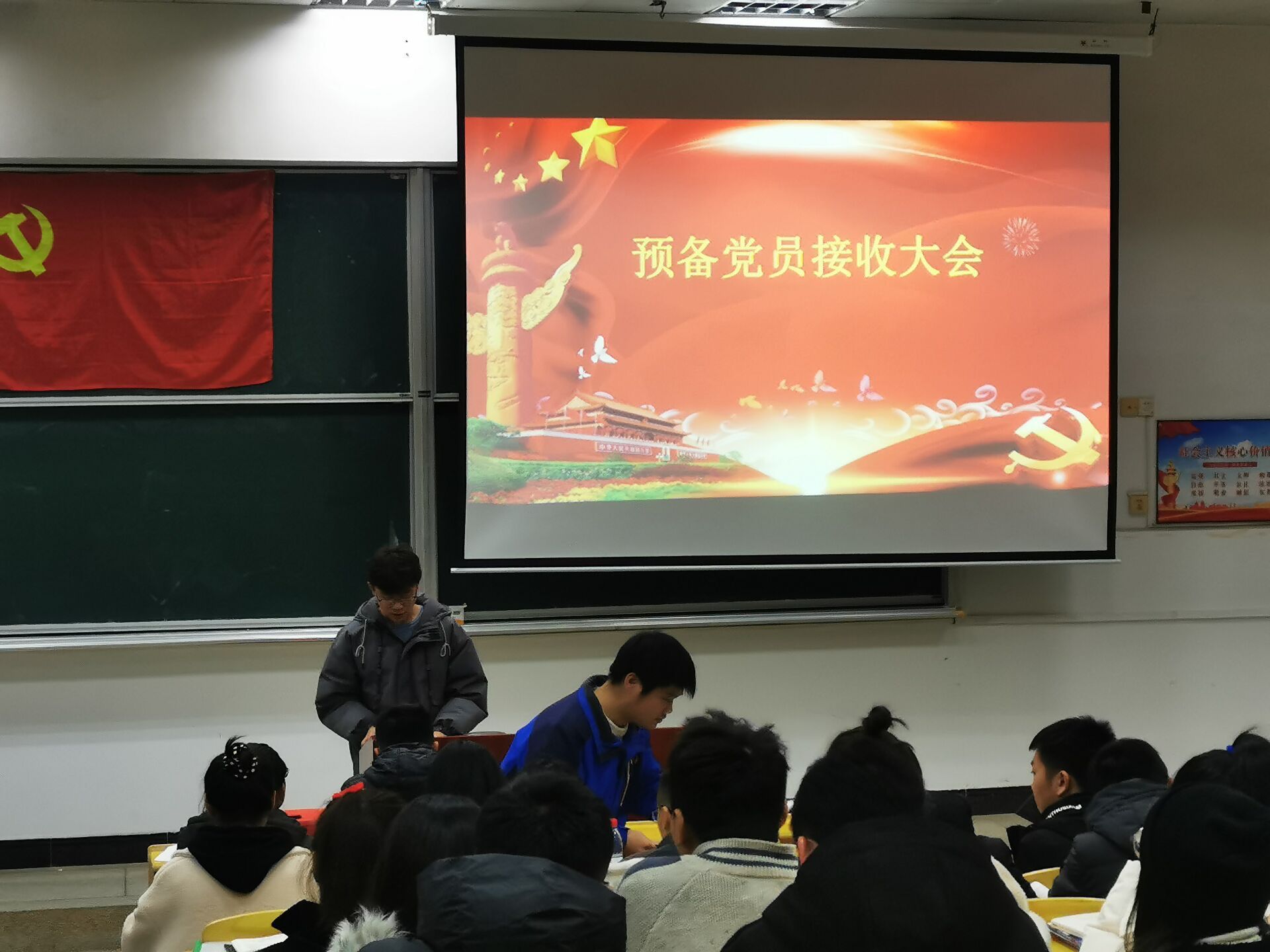 12月16日下午,政法学院学生第一党支部入党公开答辩大会暨预备党员接收大会在5栋407教室顺利进行。政法学院党委副书记吴高平、学生第一党支部书记杨婷出席,支部全体正式党员、预备党员、入党积极分子均到场参加。