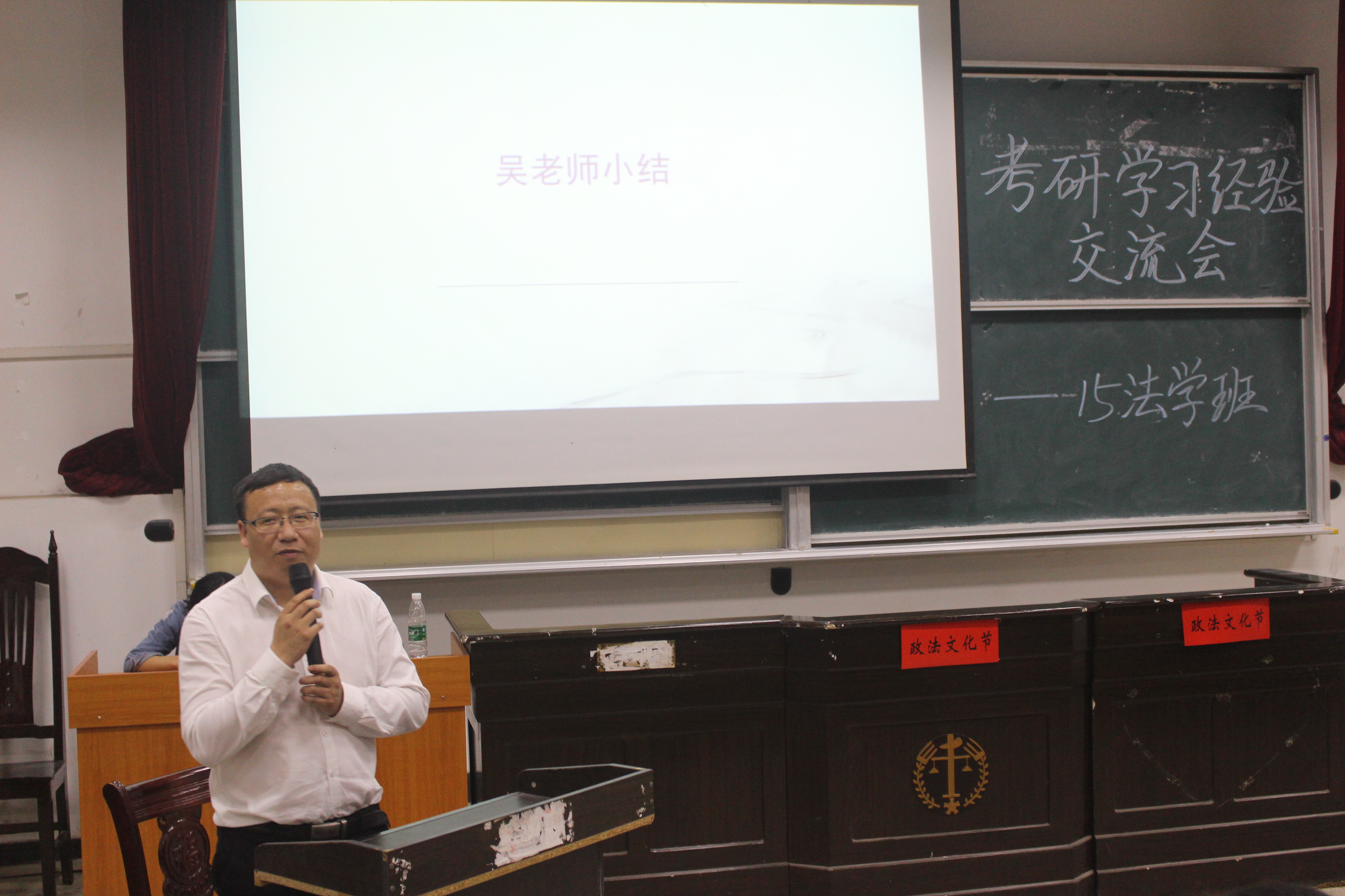 4月14日晚7时,我院15级法学班邀请李凯、刘静、谢霞、马航程、李旭博五名优秀考研学子在5栋408教室举办考研学习经验交流大会。党委委员、团委书记、学生科科长吴高平出席。