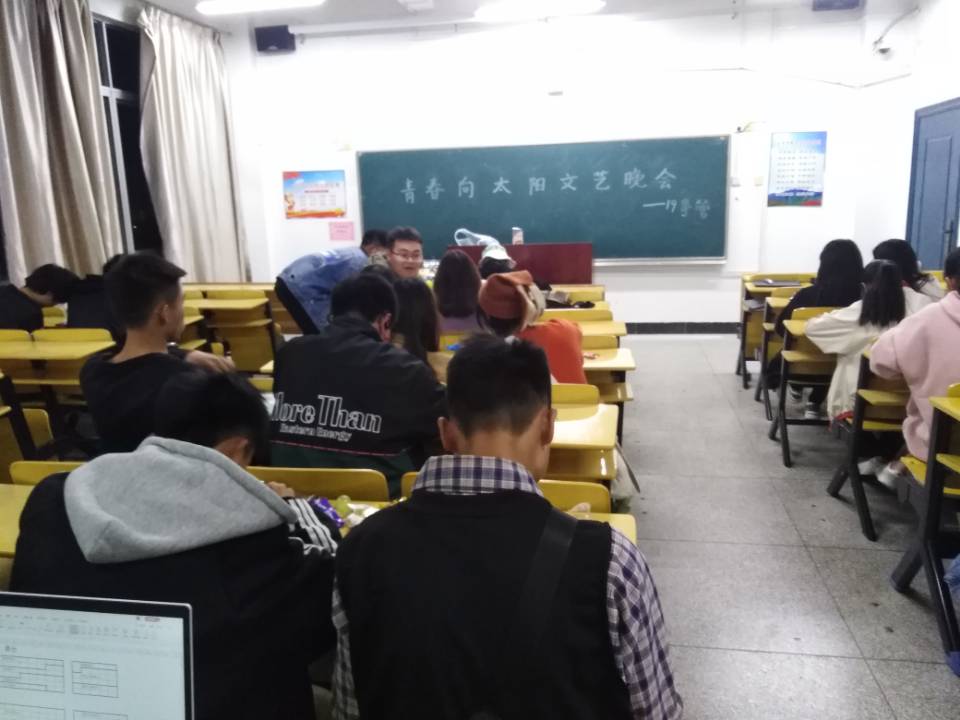 为增强同学们之间的互动性,加强班级体荣誉,11月21日晚6时30分,政法学院19事管班于5栋411室开展“青春向太阳”文艺晚会。19事管班班长担任主持人,19事管班全体成员参加。