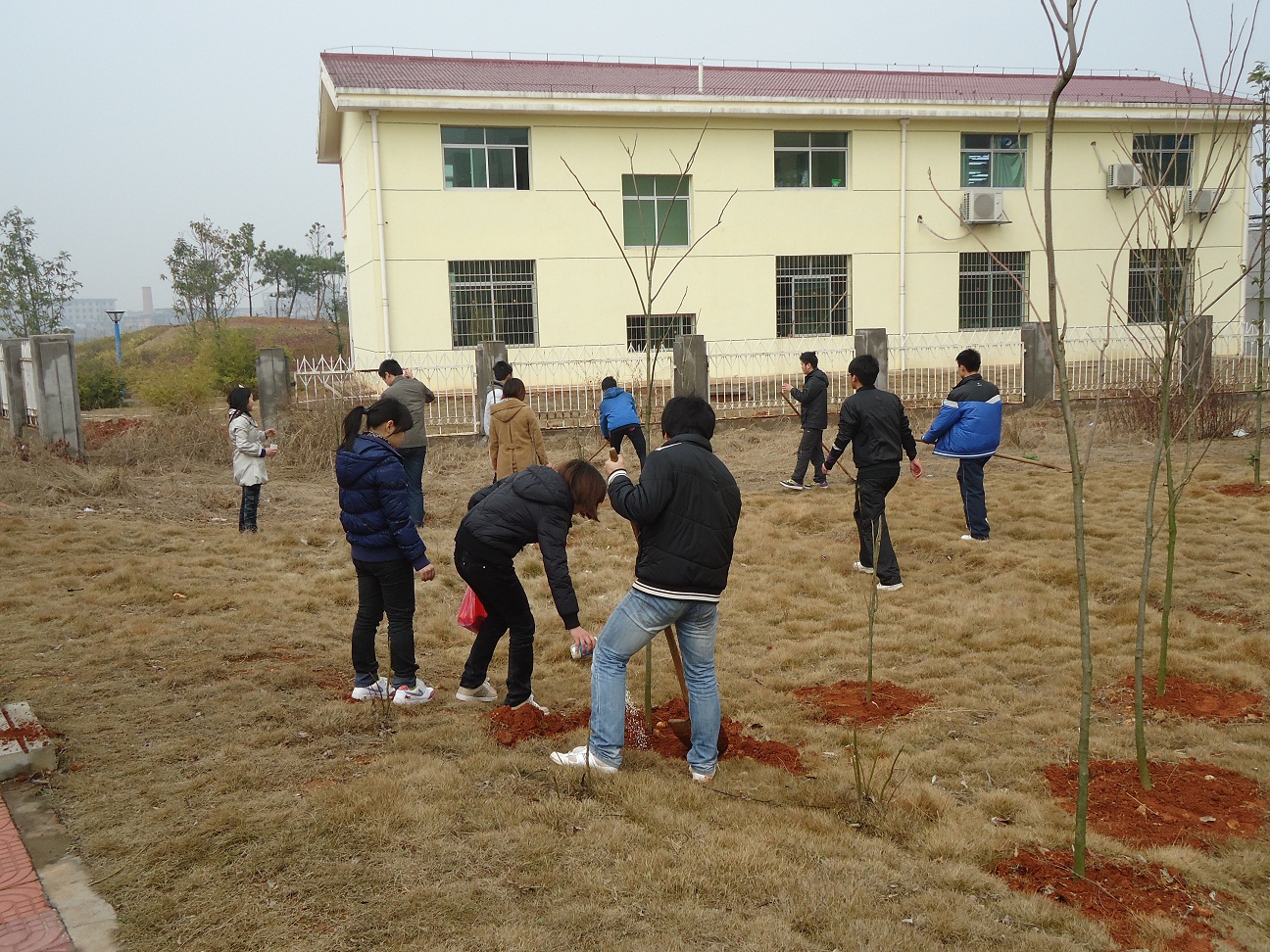 北区35栋宿舍楼前,一片热闹活泼景象,一颗颗小树苗在大家的努力下,扎根土壤的怀抱,显得生机盎然。经过一个多小时的施肥,每个人都收获颇丰,使同学们明白了植树造林的意义,提高了同学们对森林作用的认识,以达到改善校园生态环境的目的。(张文文)