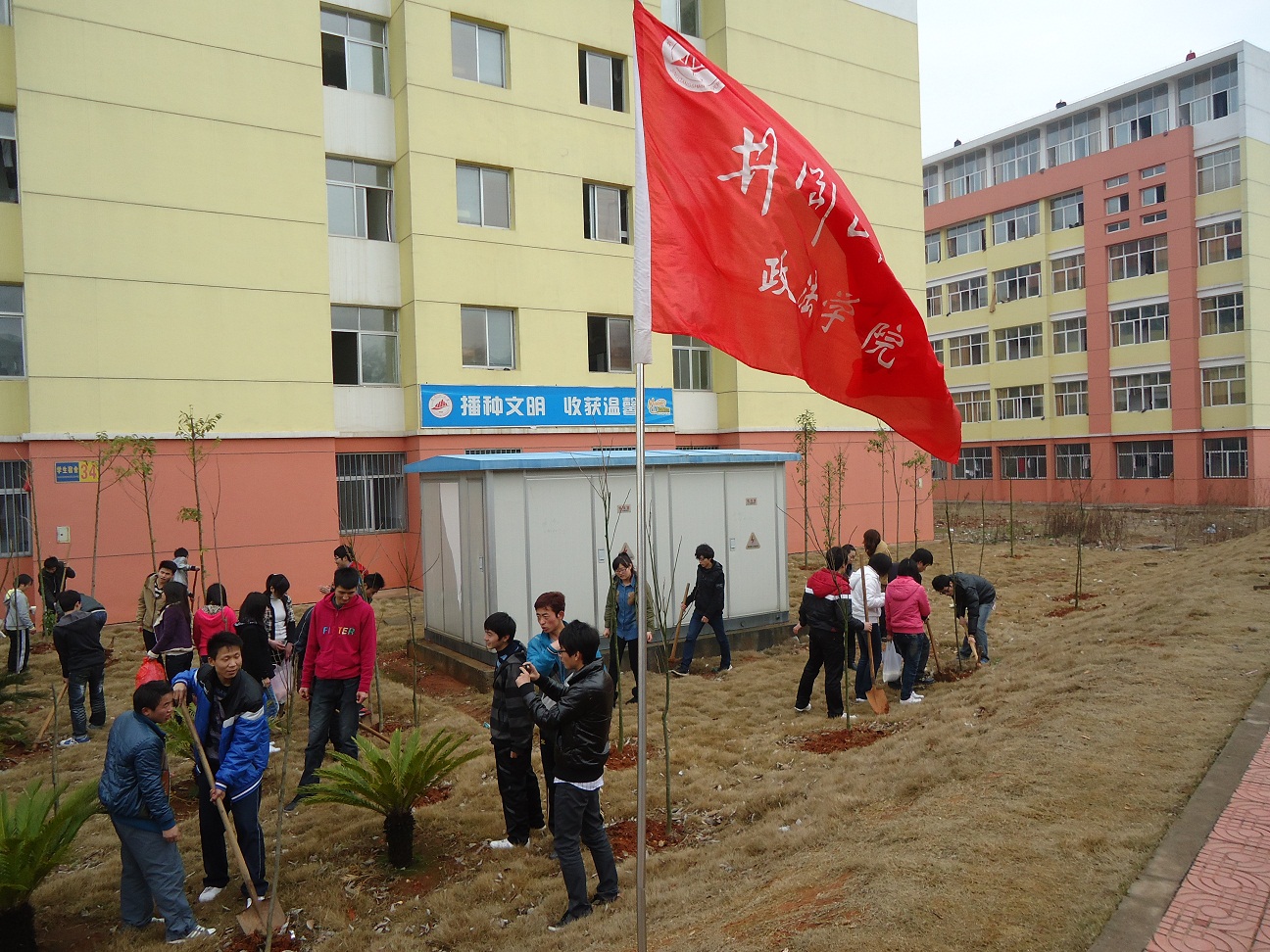 草长莺飞,绿回大地。3月15日中午,政法学院团委爱心社携手11级公共事业管理本一班,在北区为去年春天种下的小树施肥。