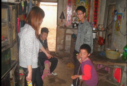 2009年当09事管班的同学了解到情况后,每周的双休日都有志愿者放弃休息,带上诸多同学的爱心捐款到李玉龙家探访,和老人聊聊天;辅导孩子学习;帮忙整理房屋卫生以及做些农活等等,想办法解决他们的难题。当地的村民对我们的行为表示认可,并且经常一起帮忙、和我们聊天反应李玉龙一家的近况。今年在政府的帮助和志愿者们奔走下,有智力障碍的李玉龙可以到付附近小学上学了,听到这消息,大家都觉得我们的坚持是值得的......