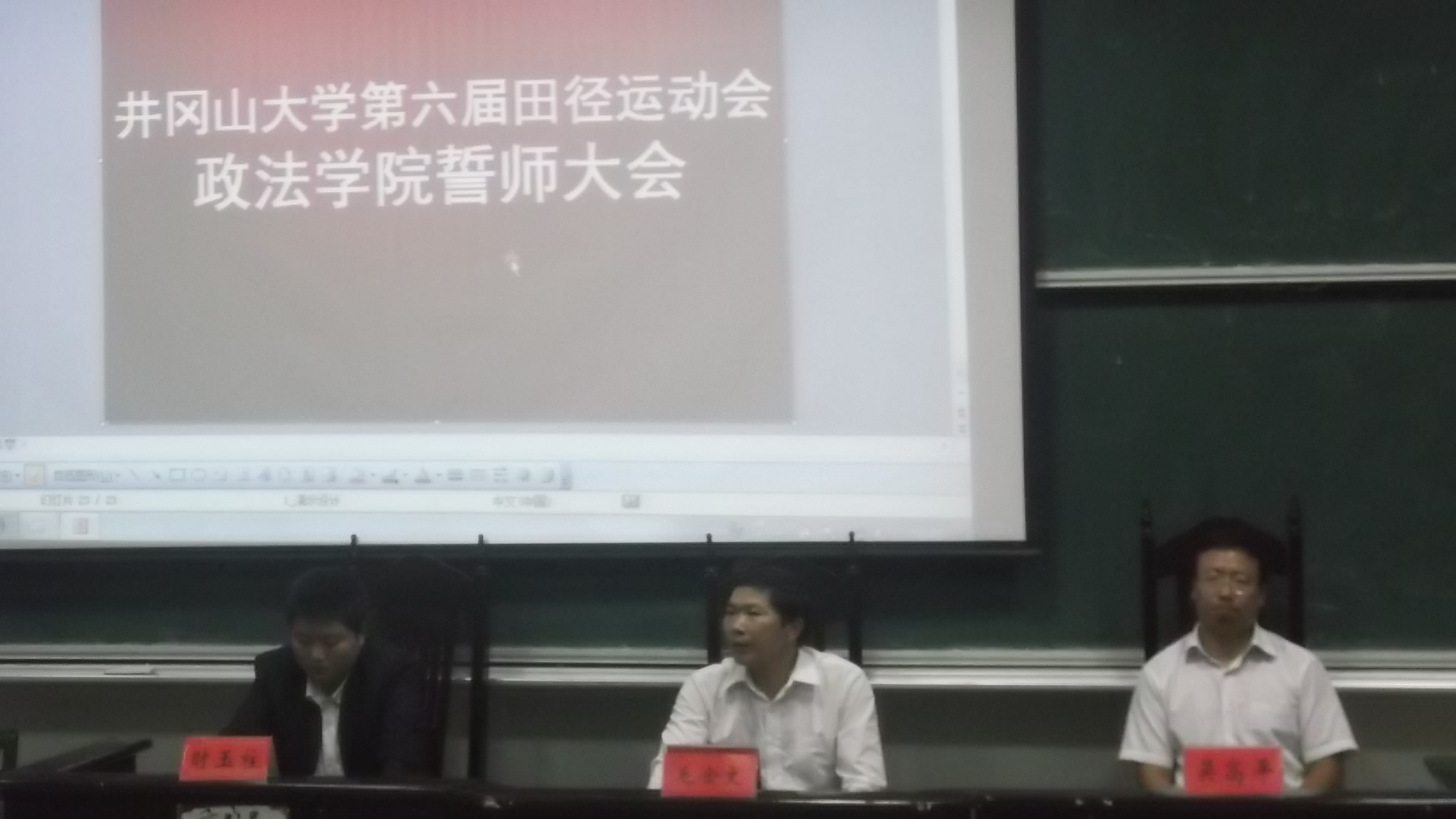 为在运动会中再创佳绩,我院于2012年10月20日在五栋408召开第六届田径运动会誓师大会。会议由院学生会主席刘国强主持。院党委副书记毛金文、团委书记兼学生科科长吴高平、学生科副科长时玉柱出席会议。教练员及我院全体运动员、学生干部参与会议。 会议期间,毛金文发表动员讲话,要求各职能部门顾全大局、细致安排,尤其强调团委学生会和各班要充分做好准备工作;要求全体运动员发扬顽强拼搏、勇于胜利的精神;要求教练组科学合理安排训练,恢复、调整好运动员体力;要求全体同学遵守纪律、服从安排,推动运动会有序进行。