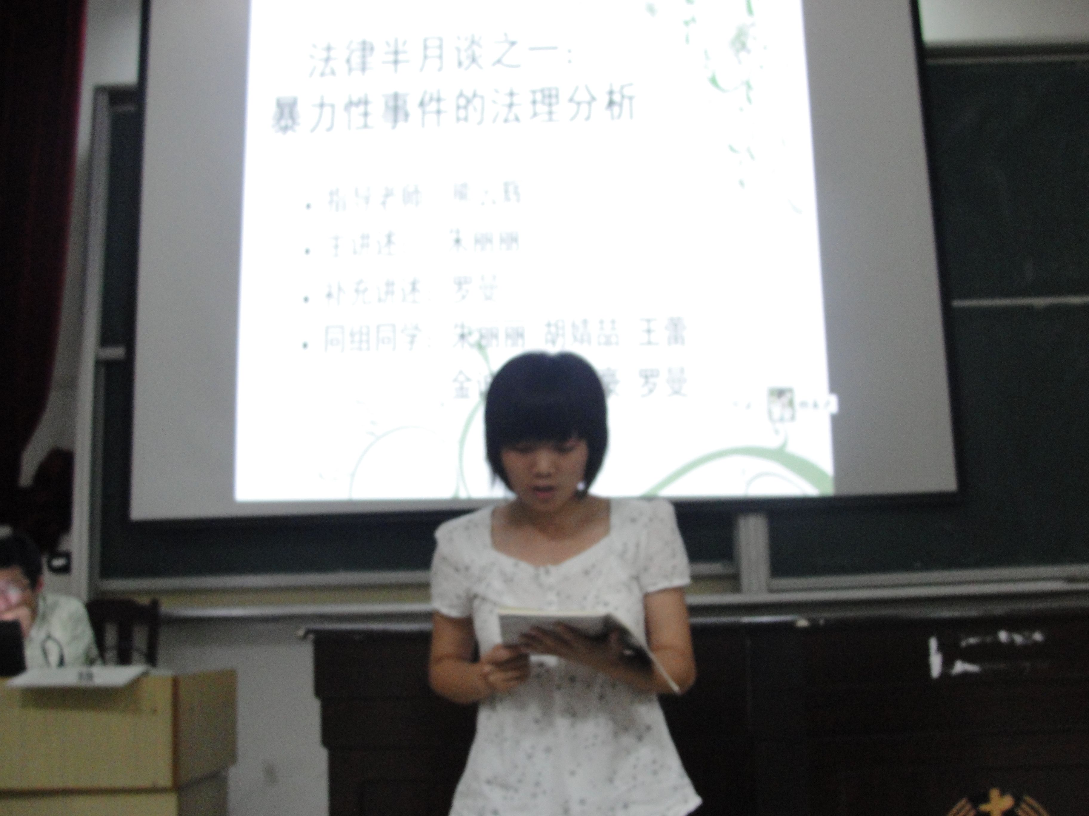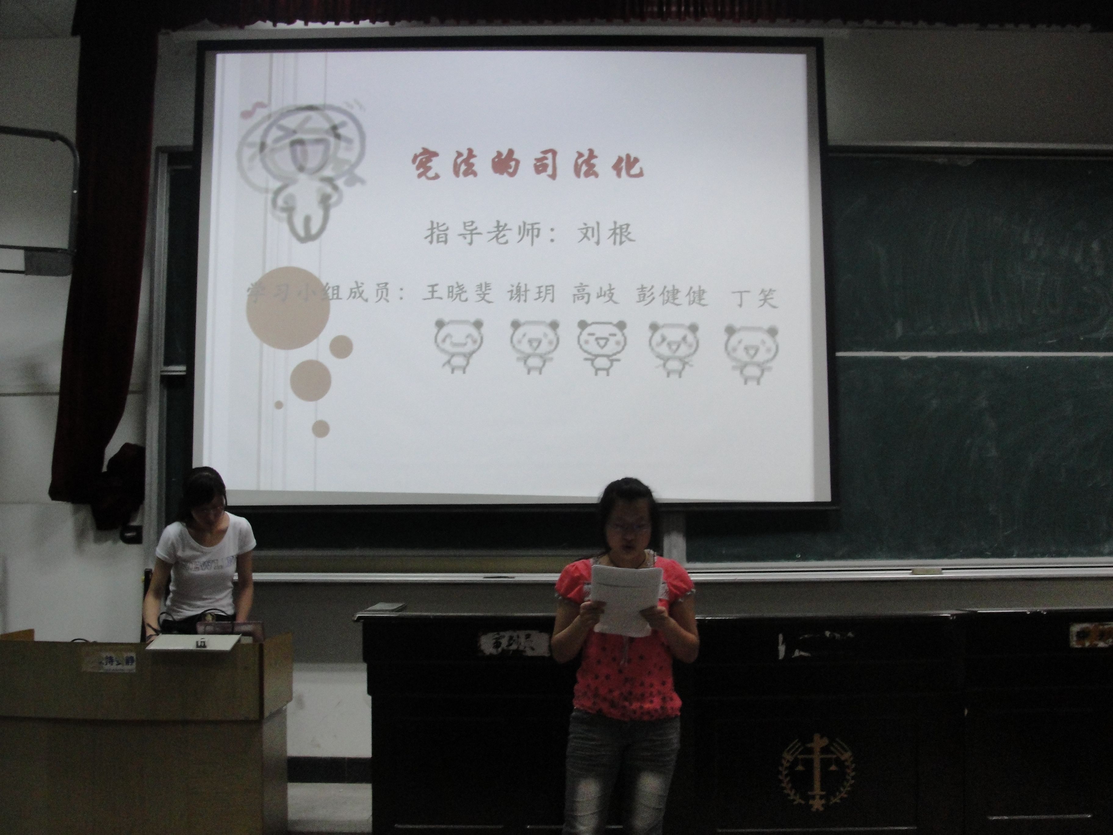本次半月谈共分两场报告会。第一场报告会由朱丽丽同学代表其小组对近期发生的一系列校园暴力性事件进行了法理分析,并呼吁我们要“团结互助,构建和谐校园”。接着由该组成员罗曼和金诚余进行补充。第二场报告会,首先是由彭健健同学代表本组对王磊所著的《宪法司法化》一书进行了深刻的讲解,言辞铿锵有力、抑扬顿挫。然后谢玥和丁笑进行补充,引起同学们深思,唤醒了我们对“宪法司法化”的重视。
