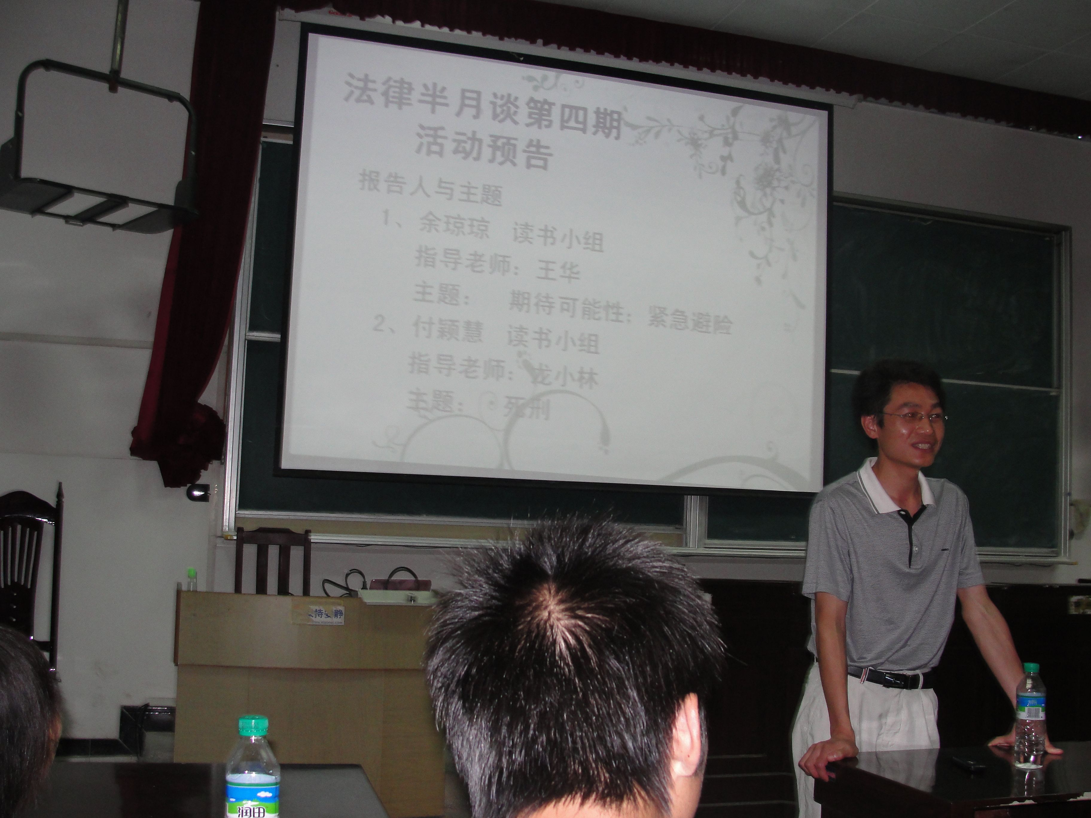 5月31日晚,我院09级法学本科班第三次暨本学期最后一次法律半月谈活动在5栋408教室成功举行。法本班班主任叶国平老师出席了本次活动。此外,参加本次活动的还有09法学本科班同学和其他专业的同学。