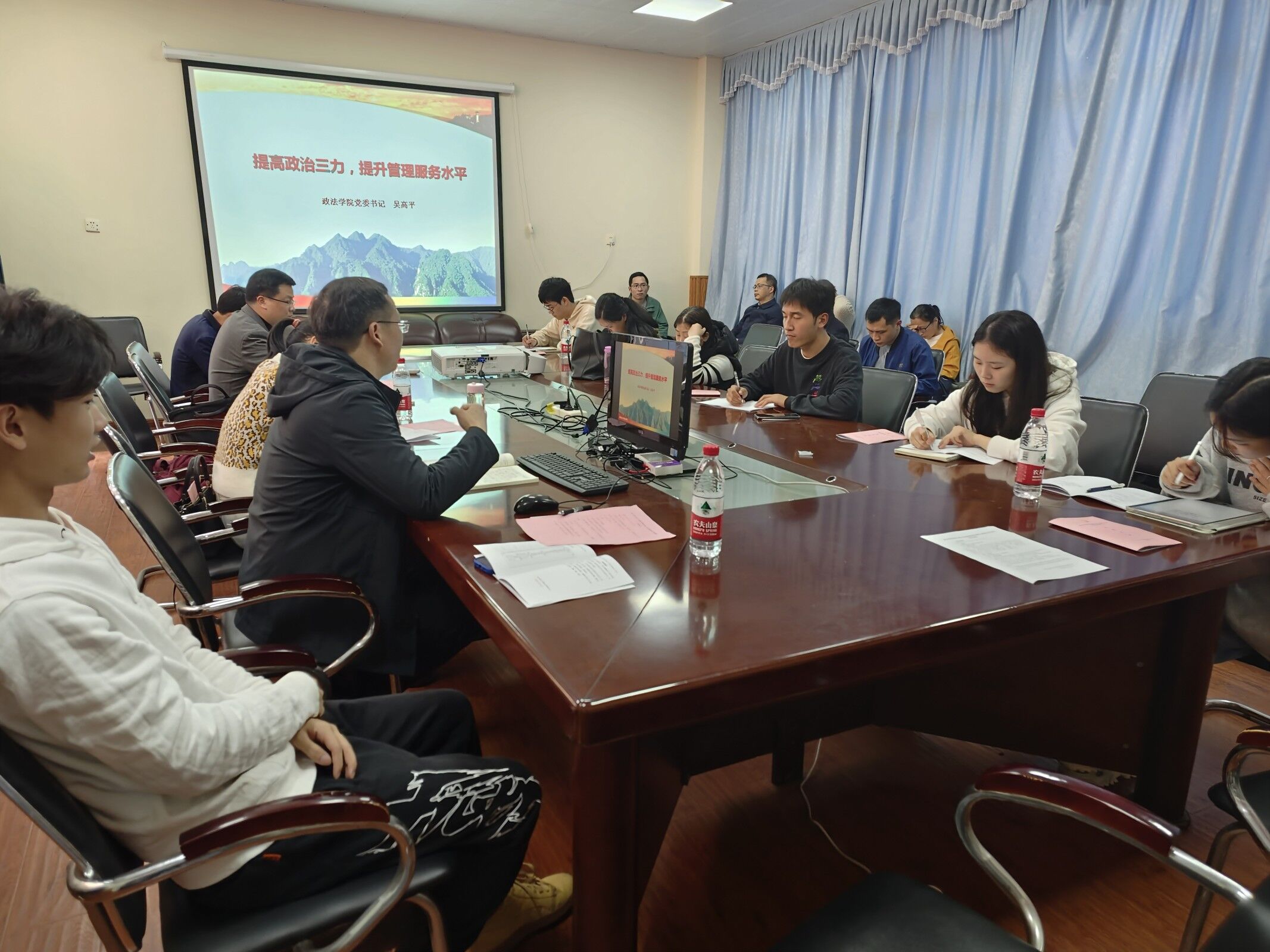 2023年3月9日下午,井冈山大学政法学院党务工作者暨管理服务人员培训班《提高“政治三力”,提升管理服务水平》讲座于5栋401举行,由政法学院党委书记吴高平主讲。政法学院政法学院系副主任,专业负责人,各教研室主任、党支部书记、各部门科长与从事党务工作人员参加此次讲座。