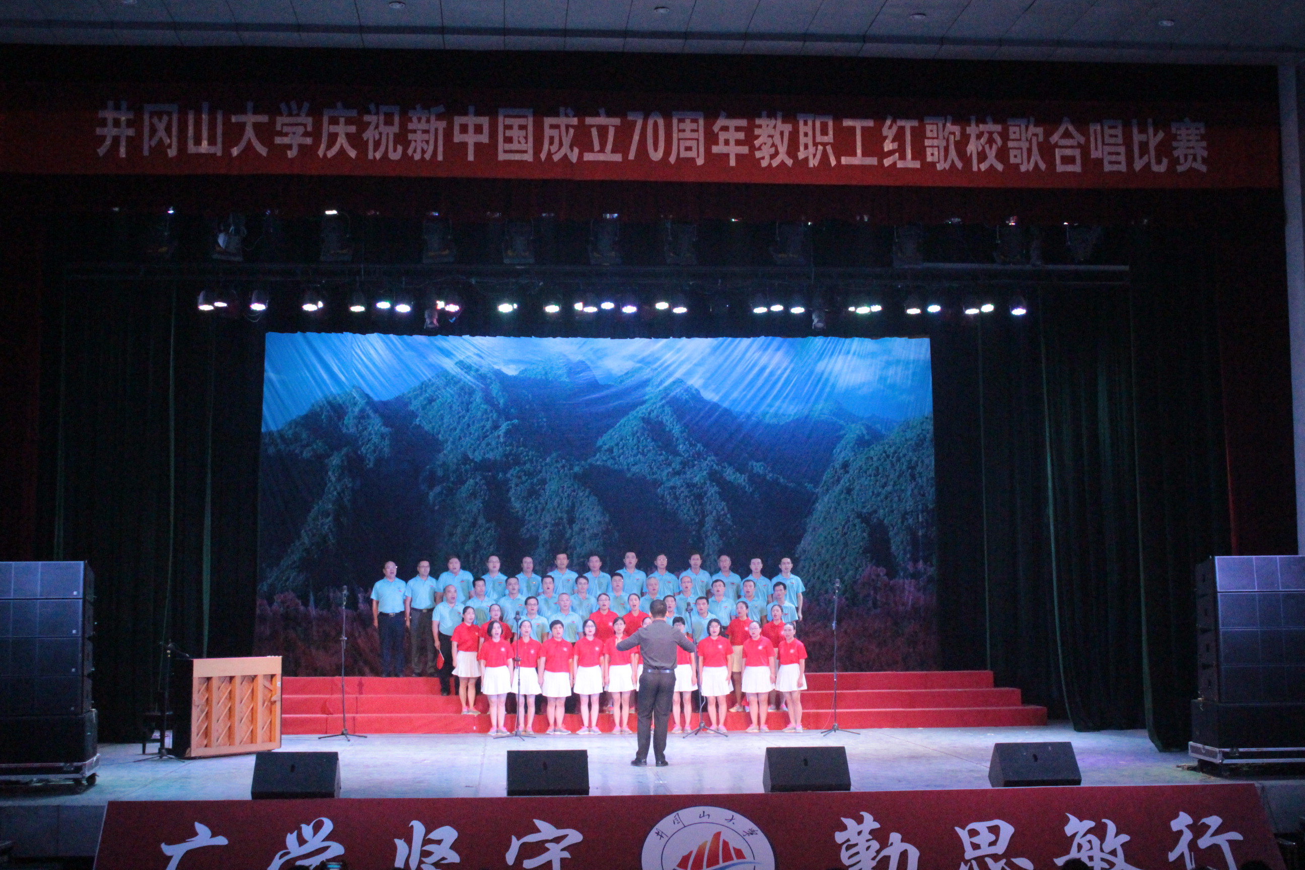 为庆祝中华人民共和国成立七十周年,9月29日晚6时30分,井冈山大学于学生会堂举行教职工红歌校歌合唱比赛。政法学院教职工代表队演唱曲目为校歌《我们创造明天的辉煌》、《我的祖国》,在本次合唱比赛中荣获三等奖。
