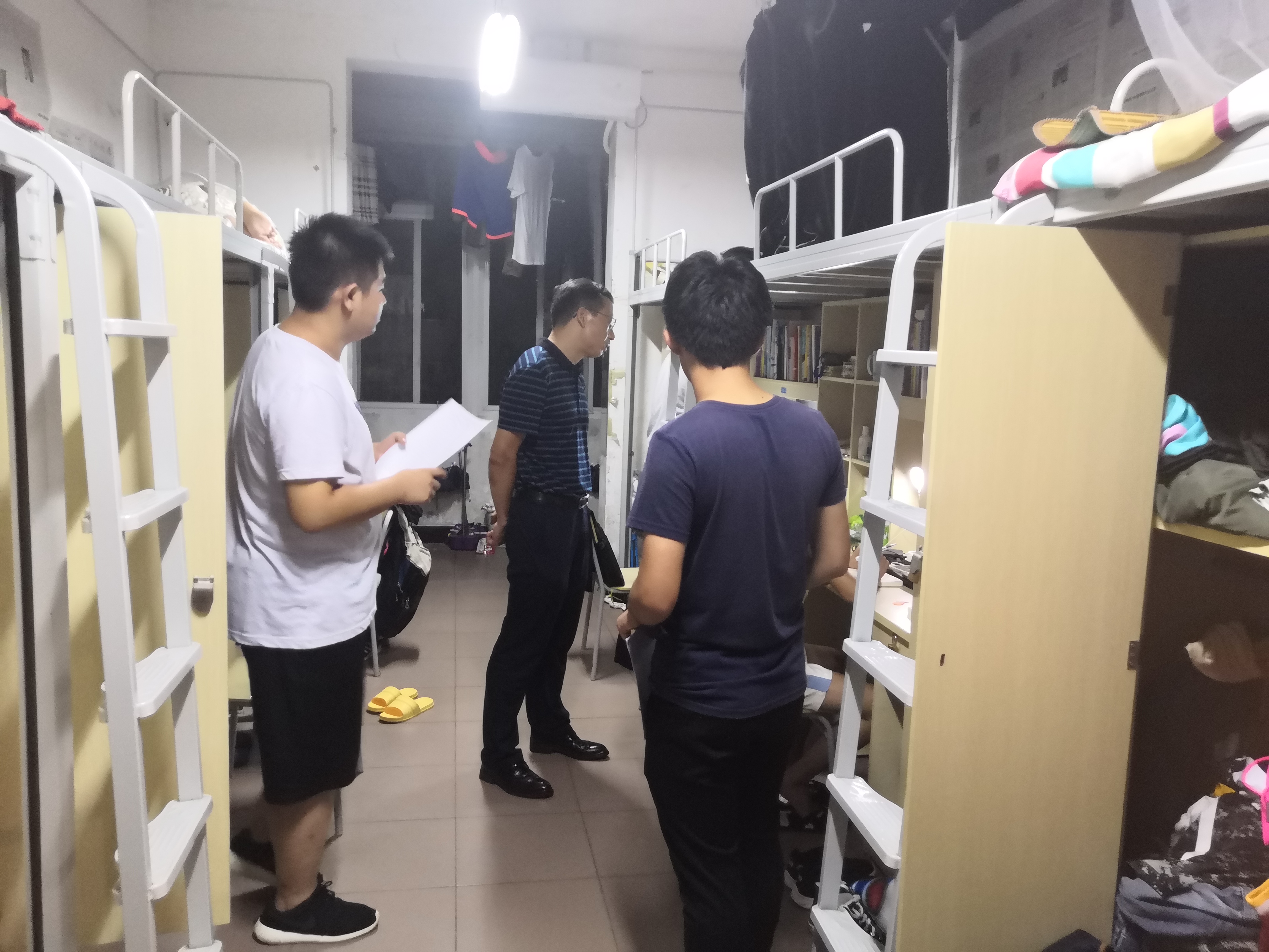 为深入了解我院学子在校生活和校外住宿情况,提高学生的安全意识。6月12日晚8时30分,我院党委副书记吴高平,团委副书记、学生科副科长杨婷,辅导员康积勤、肖文海在学生会宿管部和学生权益服务部的陪同下,分别走访了学生宿舍15栋和19栋。