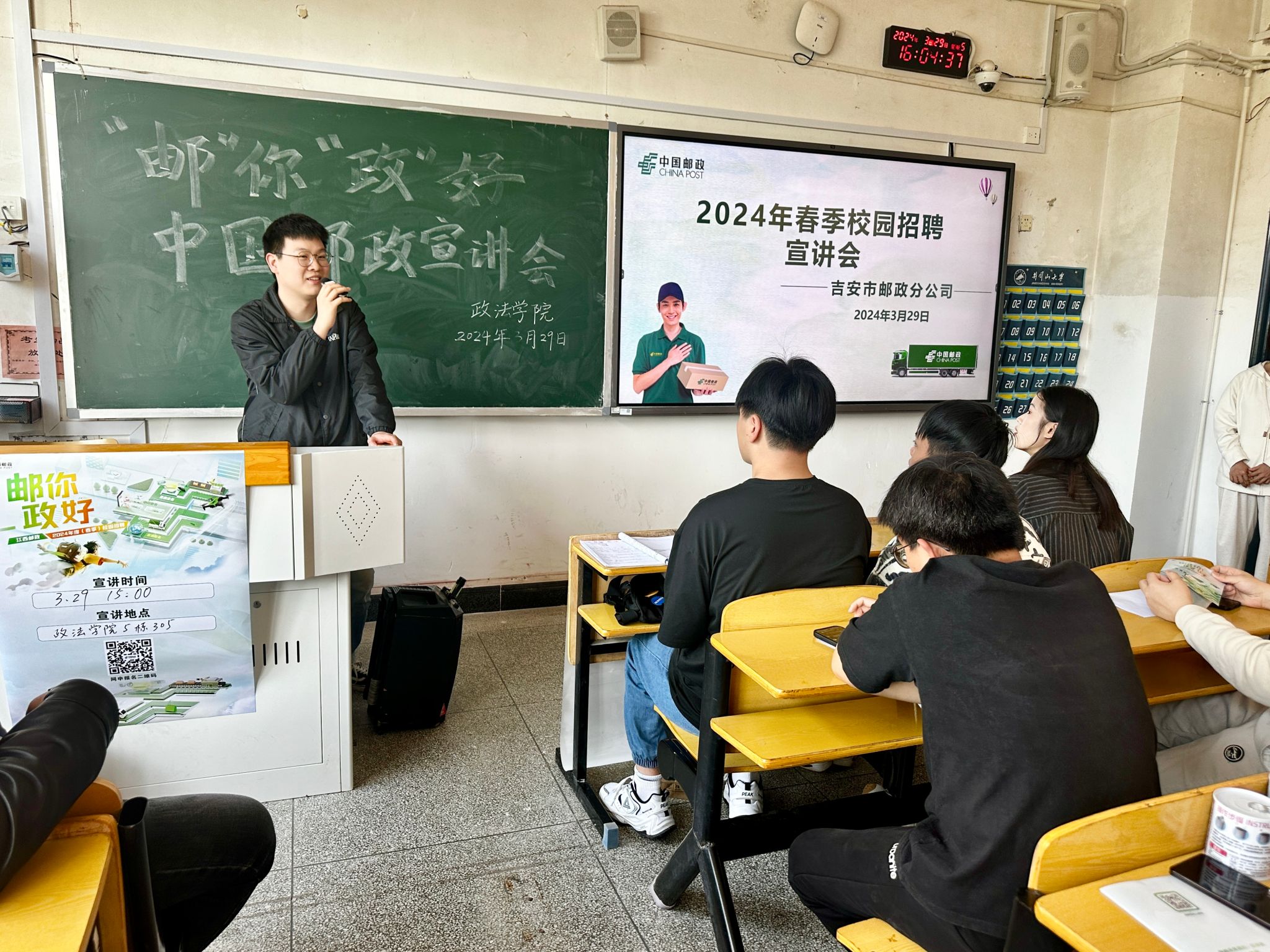 为切实做好就业服务工作,实现毕业生求职意愿与用人单位岗位需求精准对接,进一步搭建校企人才沟通合作平台,拓宽学生就业渠道。3月29日下午,政法学院邀请中国邮政集团有限公司江西省分公司入校开展2024年春季校园招聘宣讲会,宣讲会在五栋政法学院教学楼举办,由学院就业干事葛以璇老师主持,中国邮政吉安分公司相关负责人、井冈山大学2024届毕业生共计40余人参加。