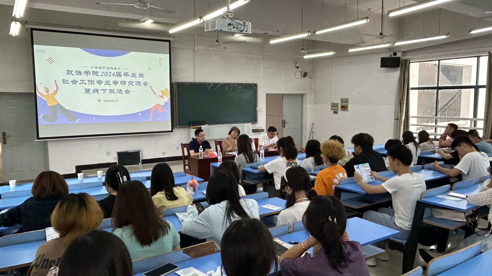 2024年6月1日上午,井冈山大学政法学院在10栋A110教室举办社会工作专业专场交流会暨2024届毕业生线下双选会。吉安市社会组织咨询评估服务中心刘晓丽副教授、江西省慈善总会主任万志强、晋江市启航社会工作服务中心总干事黄启军参与本次活动。