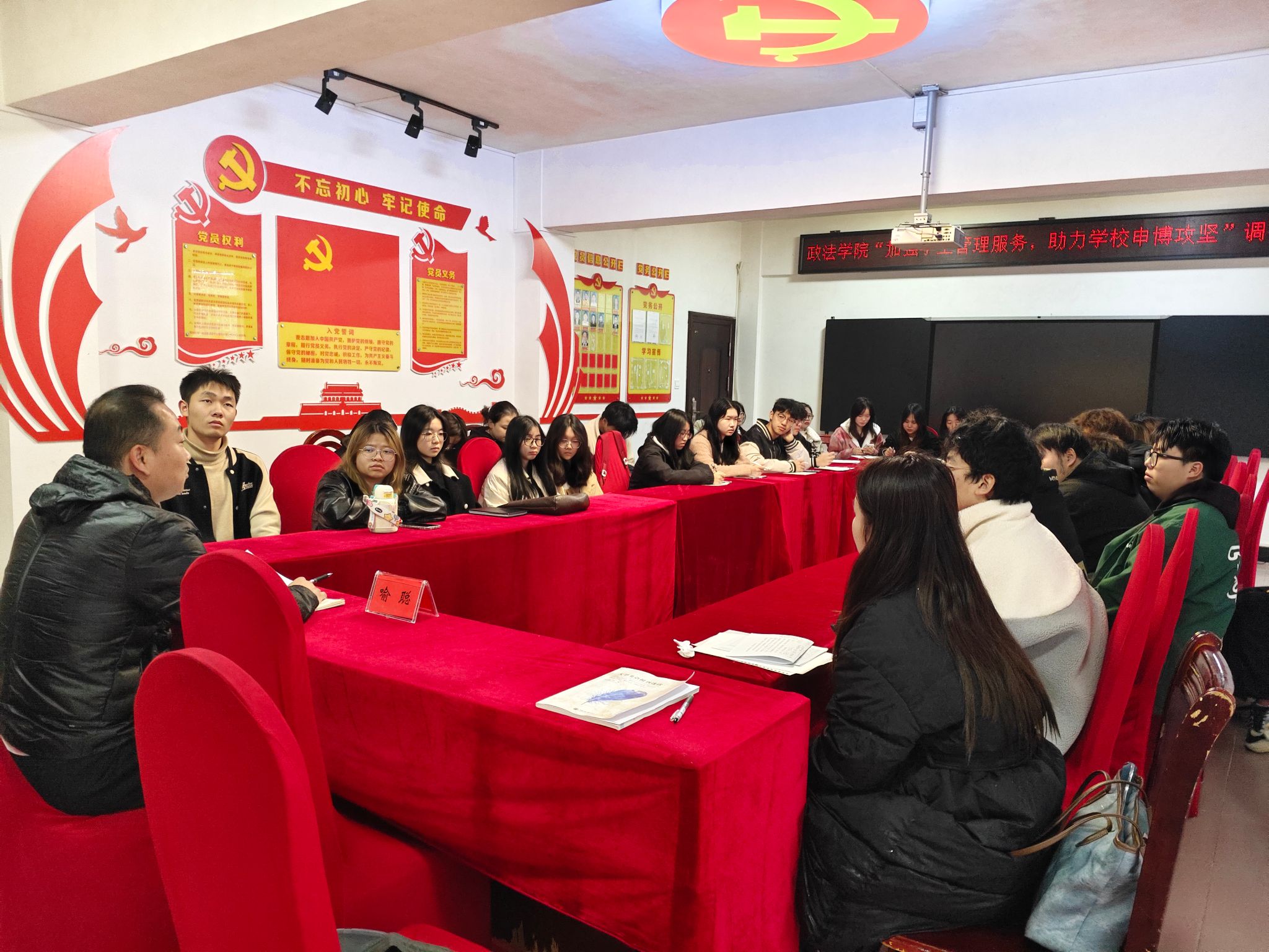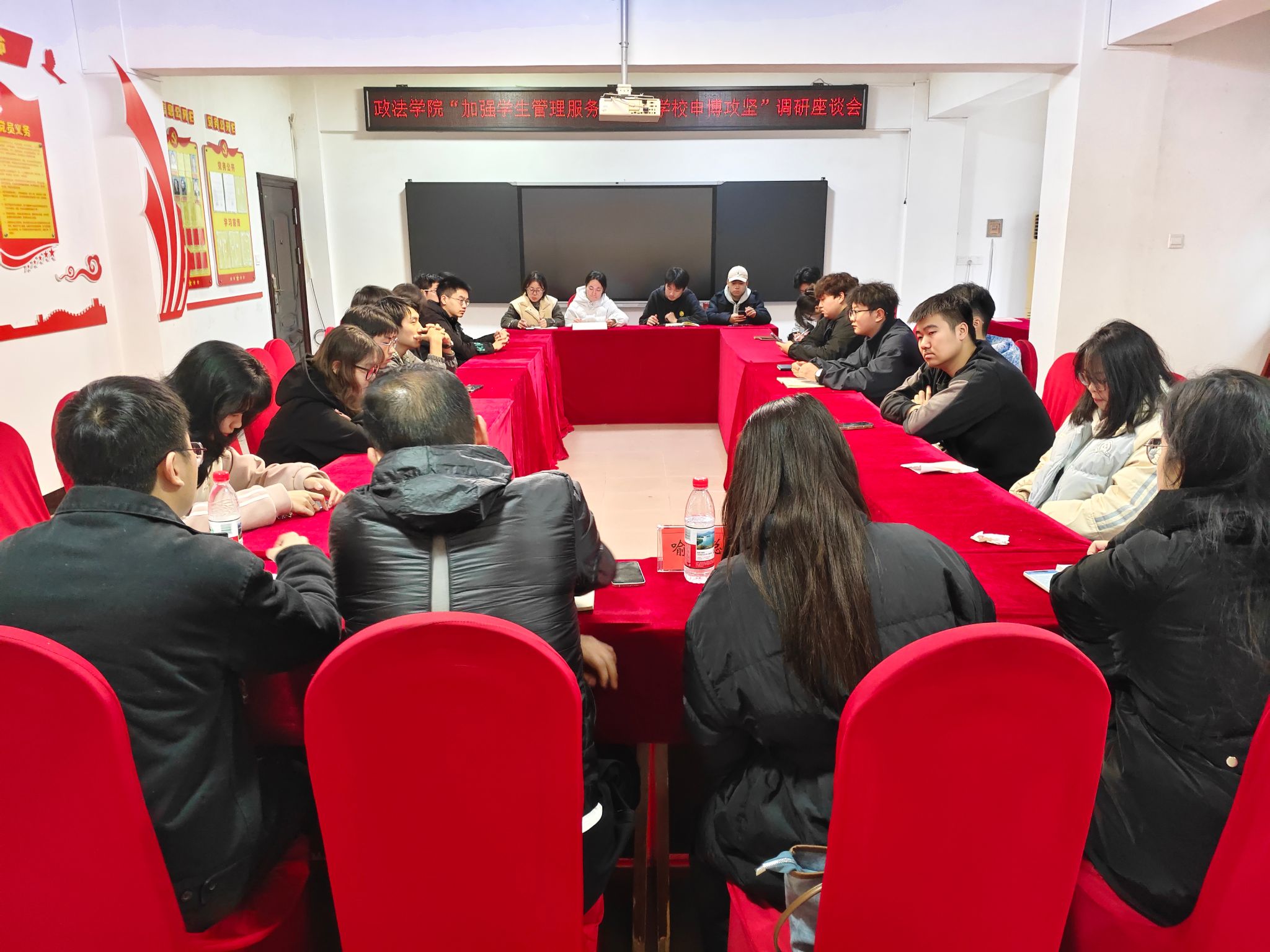 为完善学生服务体系,夯实学校申博工作基础。3月14日中午12时15分,政法学院于19栋党员活动室召开“加强学生管理服务,助力学校申博攻坚”调研座谈会。此次座谈会主要围绕团学干部队伍建设和学生教育管理服务两大议题展开。政法学院党委副书记喻聪与团委副书记、学生科副科长肖文海出席座谈会,分别与大自委团委学生会各部门代表以及各班班长、学生代表进行了深入交流。