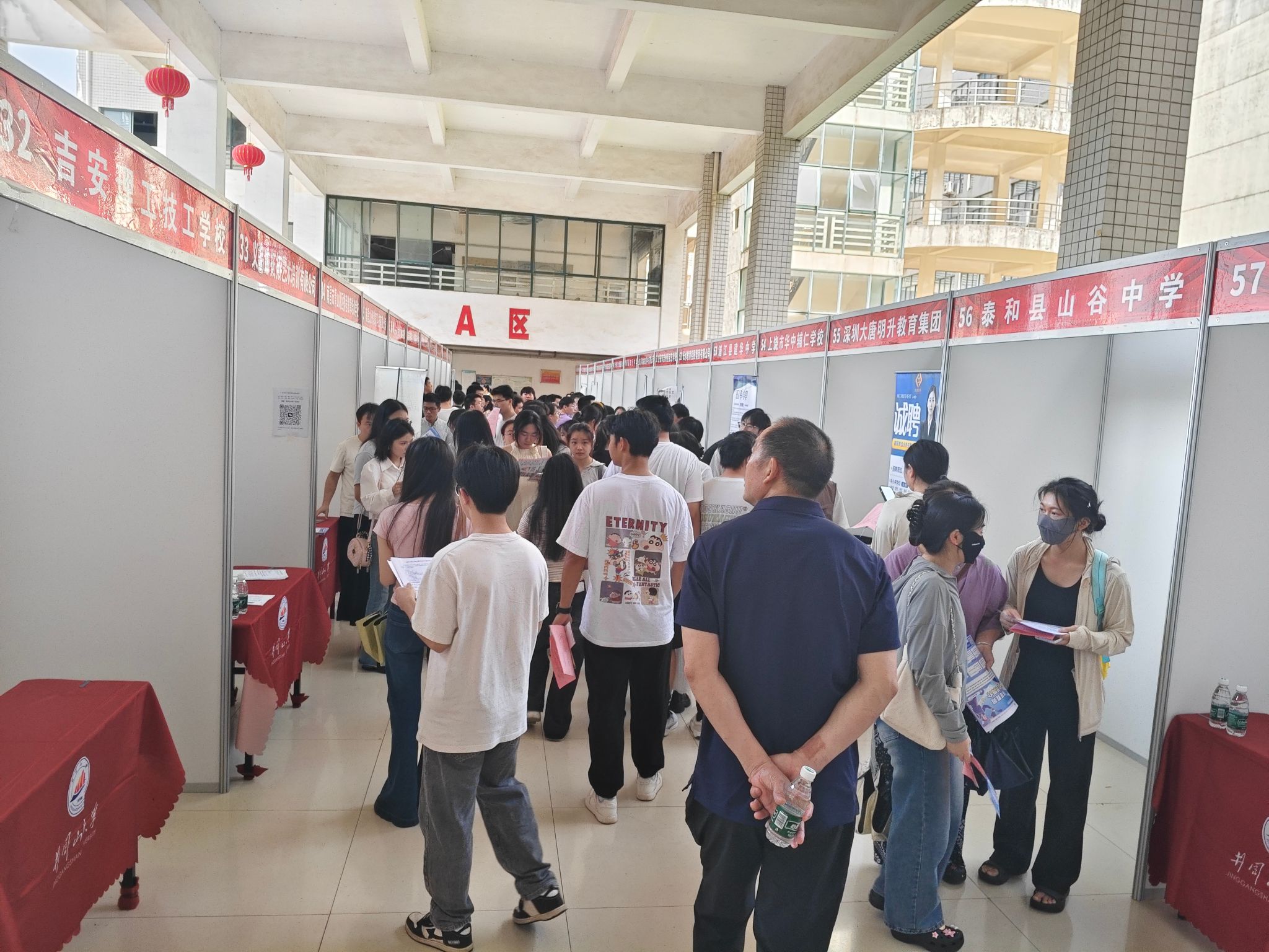 吉安青原区云中云职业技能培训学校、遂川县三合高级中学有限公司、吉安市青原区阳明实验学校、南京艺路人生文化传媒有限公司四家单位亲临现场,于十栋教学楼大厅与2025届毕业生进行面对面交流招聘。招聘会现场,企业代表向前来咨询的2025届毕业生详细介绍了单位的招聘要求、岗位设置、发展前景等信息。毕业生们则结合自身专业特长和职业规划,积极投递简历,并就薪资待遇、工作环境、职业发展路径等问题与企业代表进行了详细咨询。此外,政法学院党委书记吴高平也到达招聘会现场,与企业代表进行了深入交流,进一步了解各单位的用人需求及发展情况。