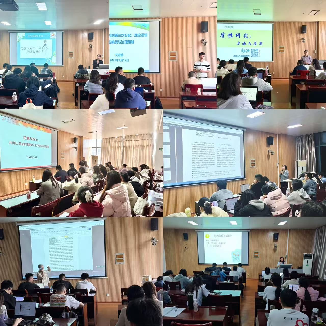 2025年3月17日,首期“广学·导师讲坛”由王才章老师以“井冈山革命时期群众工作的实践逻辑”为主题开讲。他通过文献回顾并基于历史社会学分析,深入剖析了井冈山革命时期群众工作的历史背景、具体过程及认同塑造策略。3月28日的第2期“广学·导师讲坛”,许士友老师以“社会学视角下看电影《第二十条》的法与情”为题,结合昆山“反杀”案等现实案例,引导学生从社会学视角理解法治建设。在4月2日第3期“广学·导师讲坛”上,仰和芝老师聚焦《本土与历史:井冈山革命实践蕴含的社会工作智慧》,指出社会工作需扎根本土文化与历史,强调从历史脉络中挖掘理论资源,运用“以人民为中心”的理念指导当代社会工作实践。