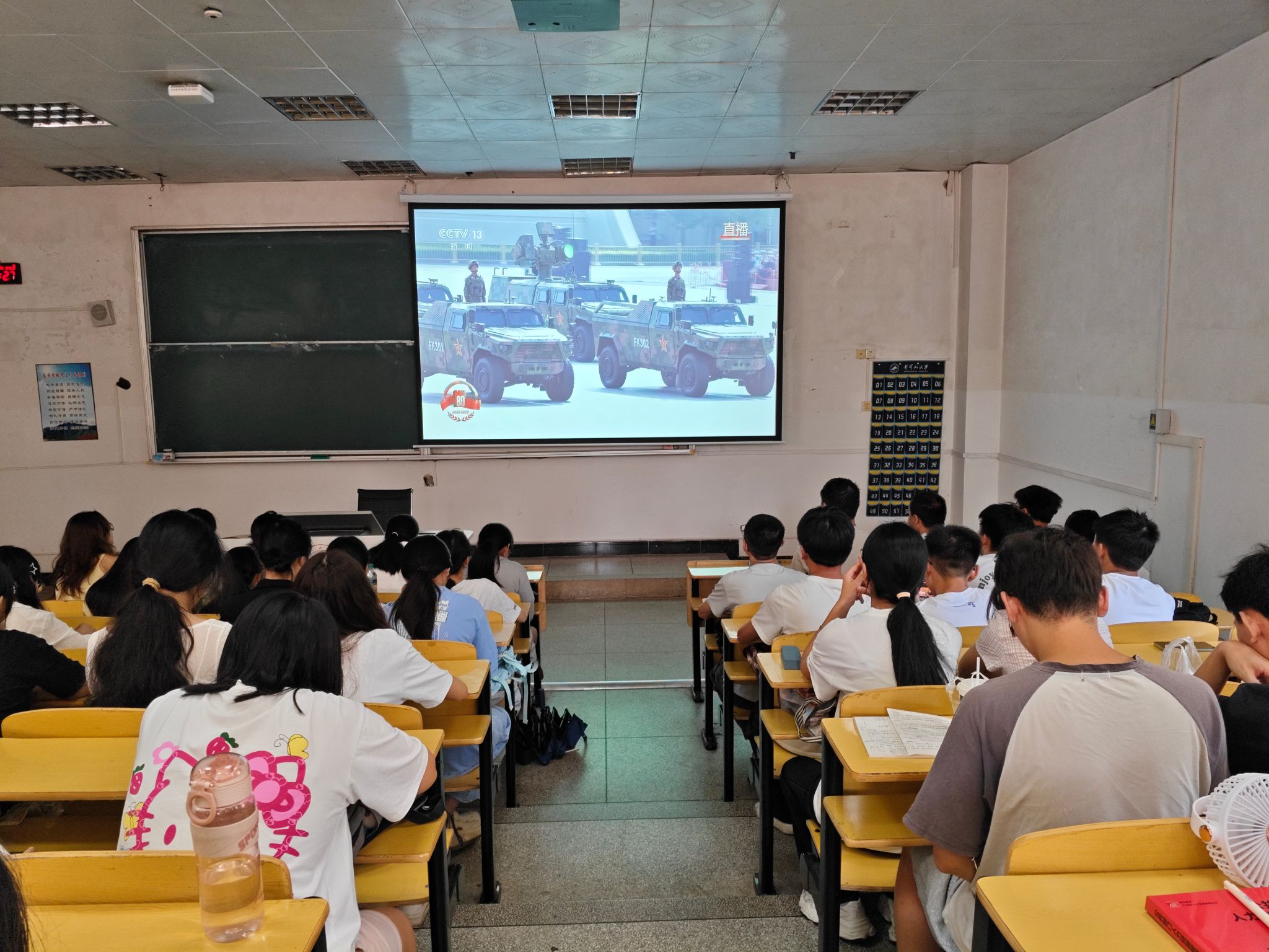 阅兵仪式上,整齐划一的徒步方队、威武先进的装备方队以及翱翔天际的空中梯队依次通过天安门广场接受检阅,这展示了新时代中国强大的国防力量和军队现代化建设的卓越成就。观看过程中,各个教室现场气氛热烈,同学们目不转睛地盯着屏幕,不时响起阵阵掌声和赞叹声;党员活动室里,学生骨干同样全神贯注,并在阅兵仪式结束后围绕“铭记历史”“吾辈当自强”等主题进行了交流与讨论。