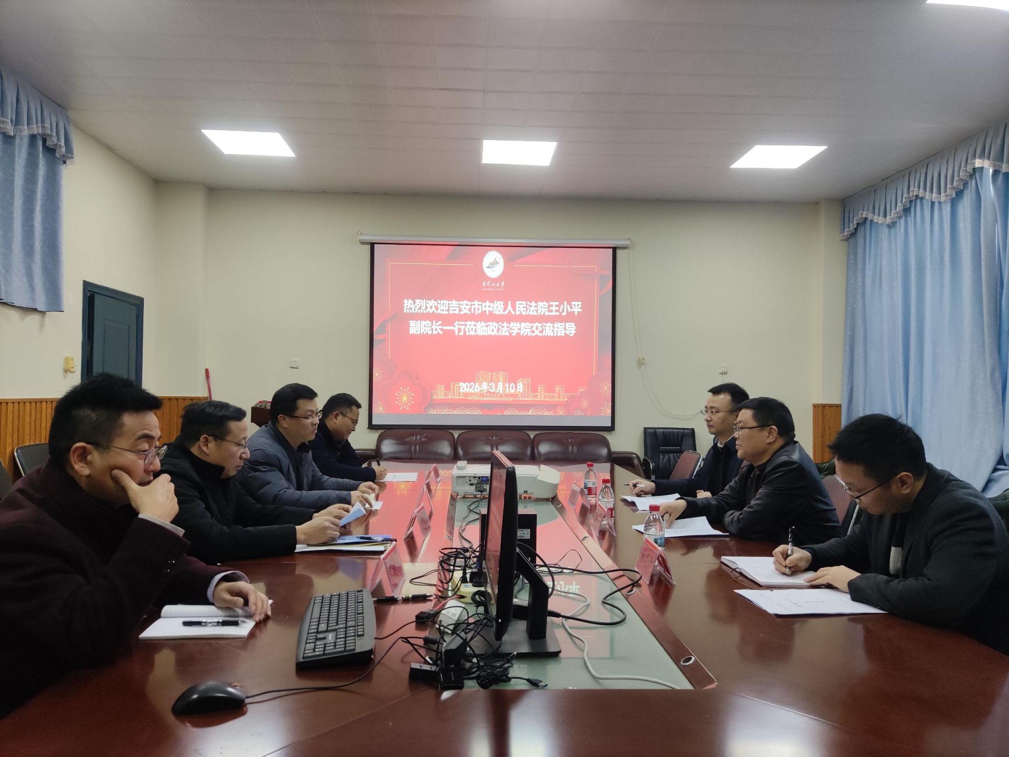 为深化法学教育与司法实践融合,搭建校地协同育人平台,3月10日,吉安市中级人民法院副院长王小平一行莅临政法学院,就双方合作签约相关事宜开展交流座谈。政法学院党委书记吴高平、院长习剑平出席座谈,相关法学博士参与交流,双方围绕合作细节、仪式安排及未来发展前景深入磋商,达成广泛共识,拟于近期签订正式合作协议。