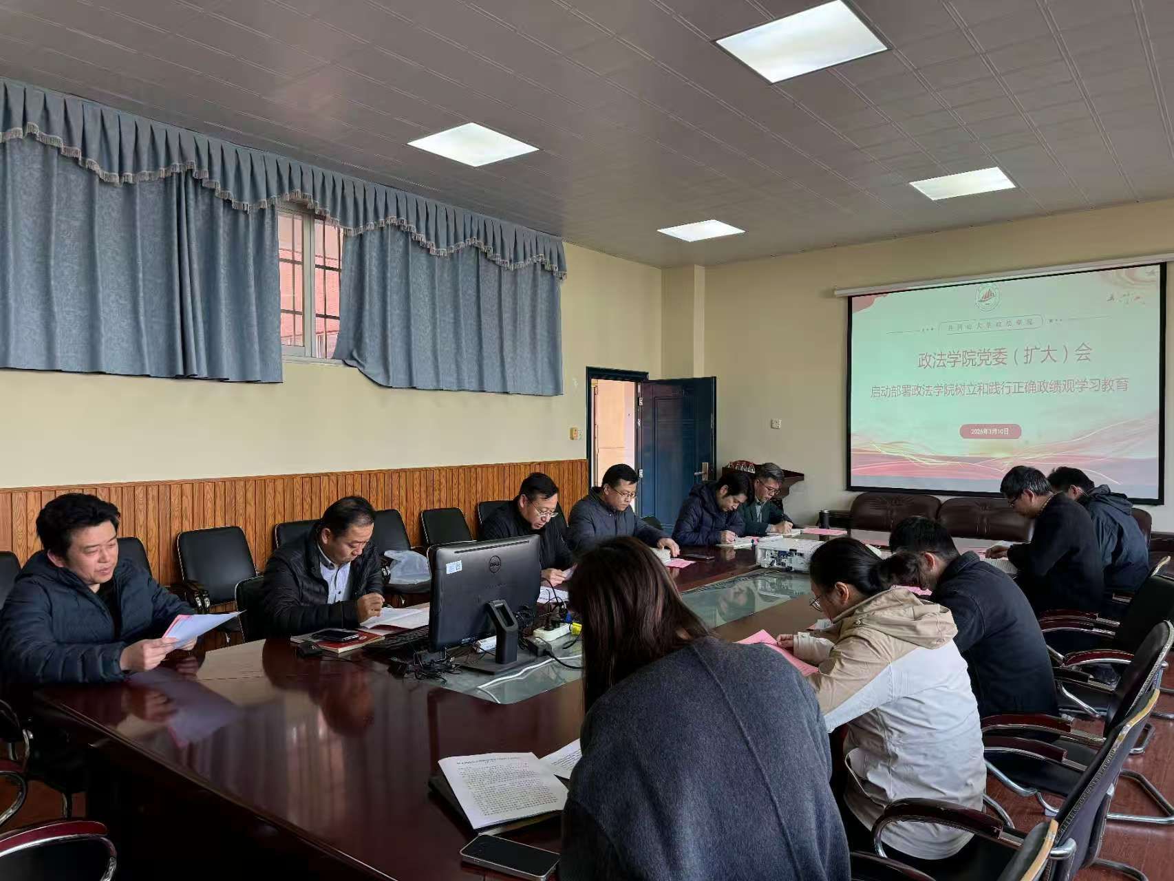 3月10日下午,政法学院党委在五栋401会议室召开党委(扩大)会议,深入学习贯彻习近平总书记关于树立和践行正确政绩观学习教育的重要讲话和重要指示精神,启动部署全院树立和践行正确政绩观学习教育工作,学院领导班子全体成员、党支部书记和各科室负责人参会。