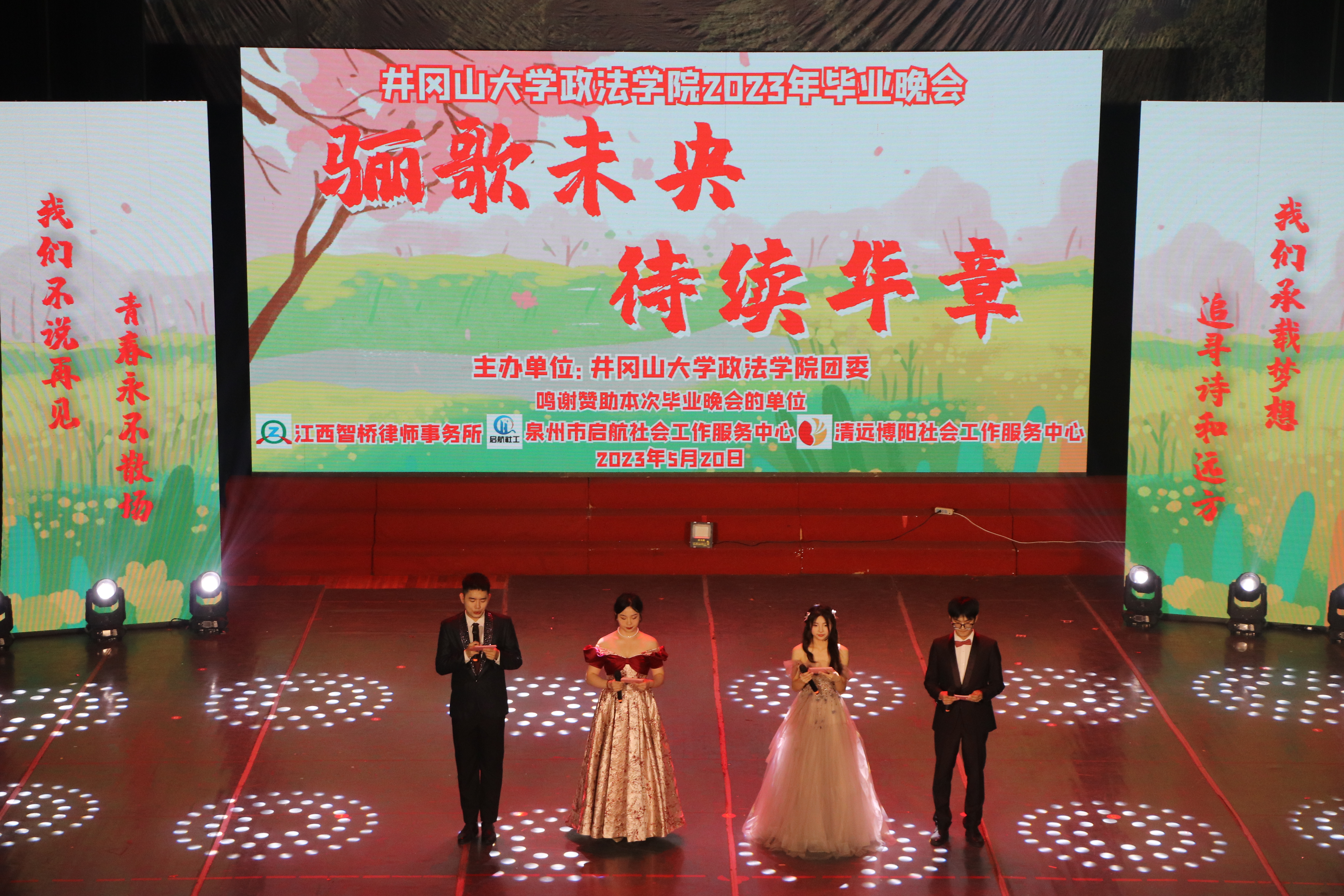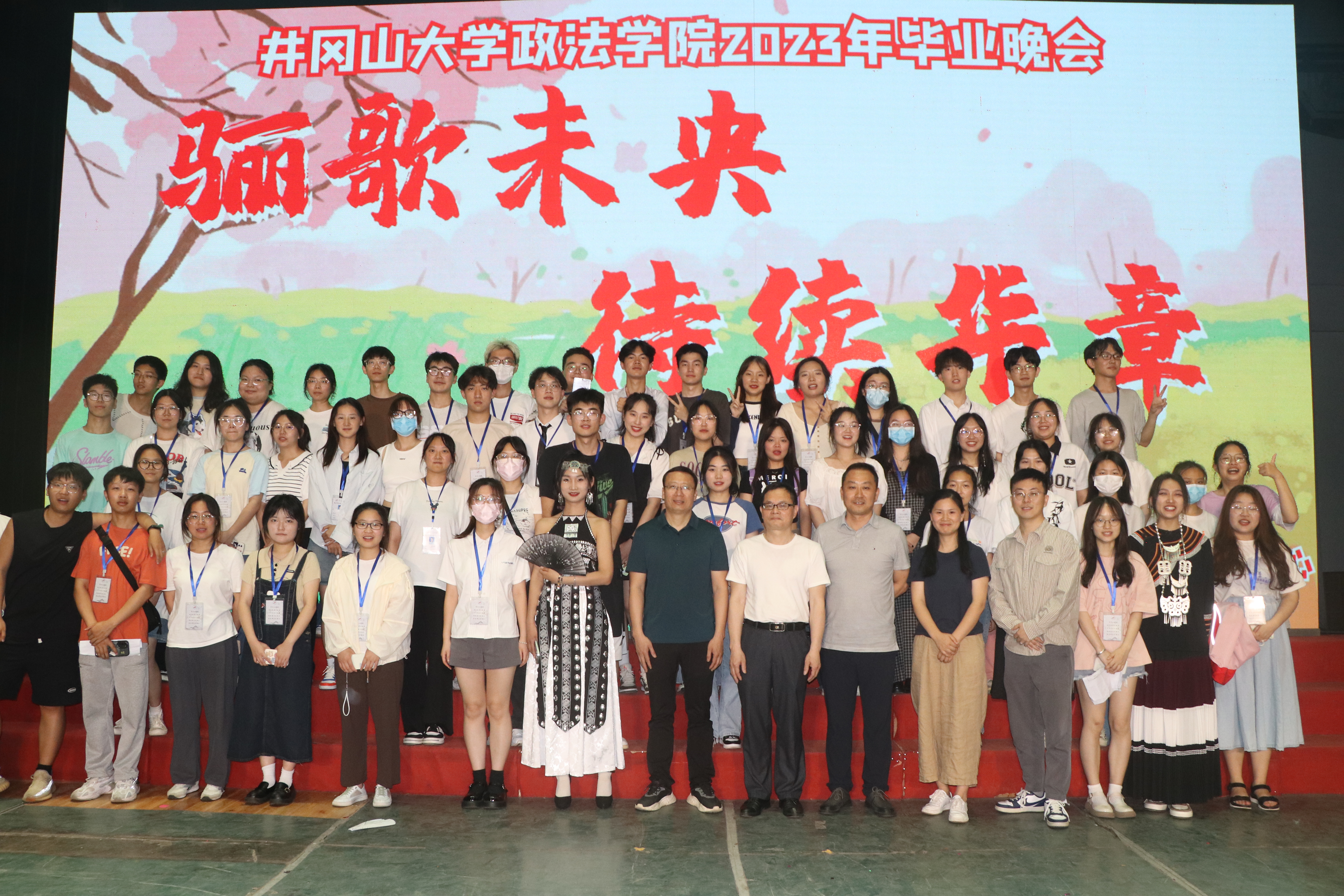 本场晚会的成功举办为我院2023届毕业生们留下了美好的回忆,宇土茫茫,山高水长,哪里都是属于少年们的青春征途。此夜,我们相约在一起,将歌声化作祝福,将离别化作力量,带着师长的嘱托与大家的祝福,从母校出发,翻开人生的下一篇章。愿每一位政法学子今后无论走到哪里,都能砥砺初心,无畏前行,用自己的方式传承井冈山精神,为中华民族伟大复兴的中国梦而奋斗。(图文/政法学院新闻部 胡达豪)