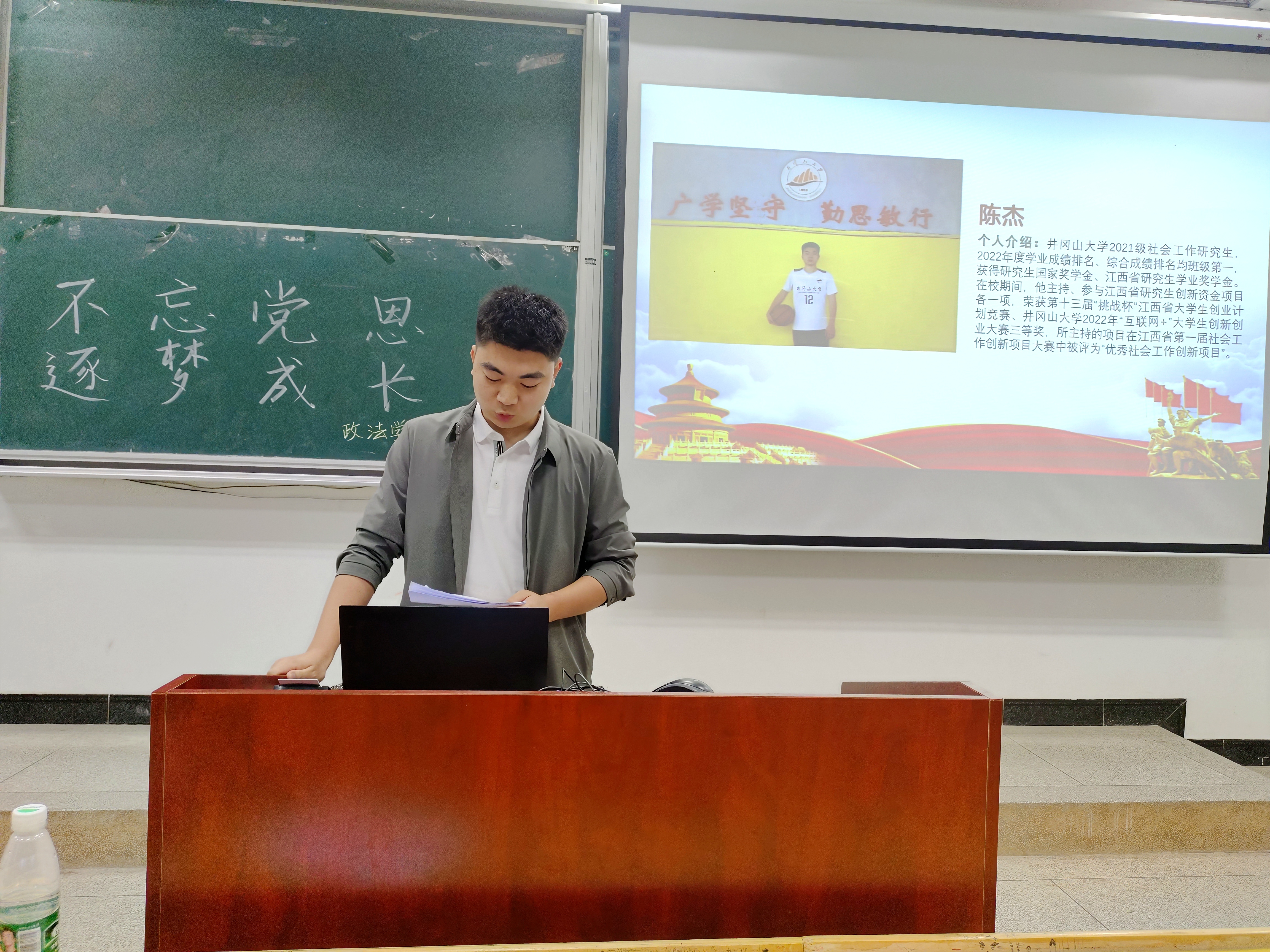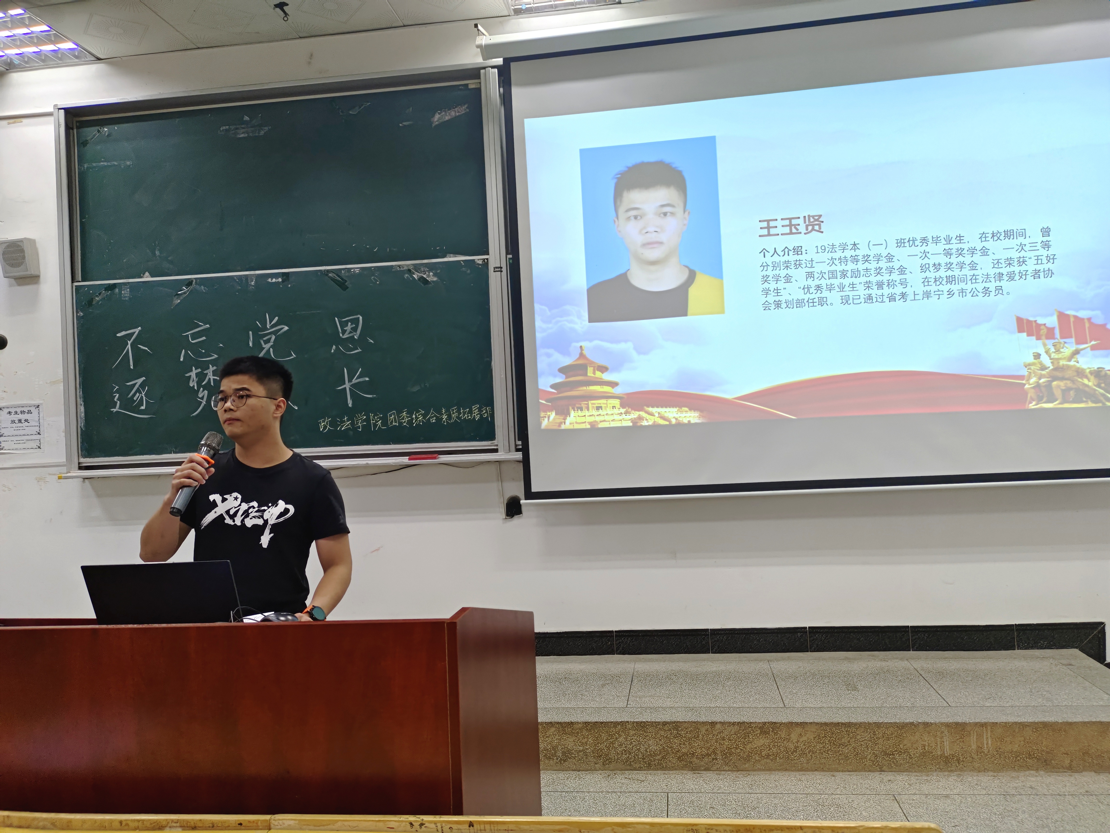 中华民族能够实现从站起来、富起来到强起来的历史性飞跃,根本原因在于中国共产党的领导,我们始终要感党恩、听党话、跟党走。5月23日晚6时30分,政法学院于5栋307教室举办“不忘党恩,逐梦成长”励志讲座,特邀优秀研究生毕业生陈杰、优秀本科生毕业生王玉贤担任主讲人。学院部分学生参与聆听。