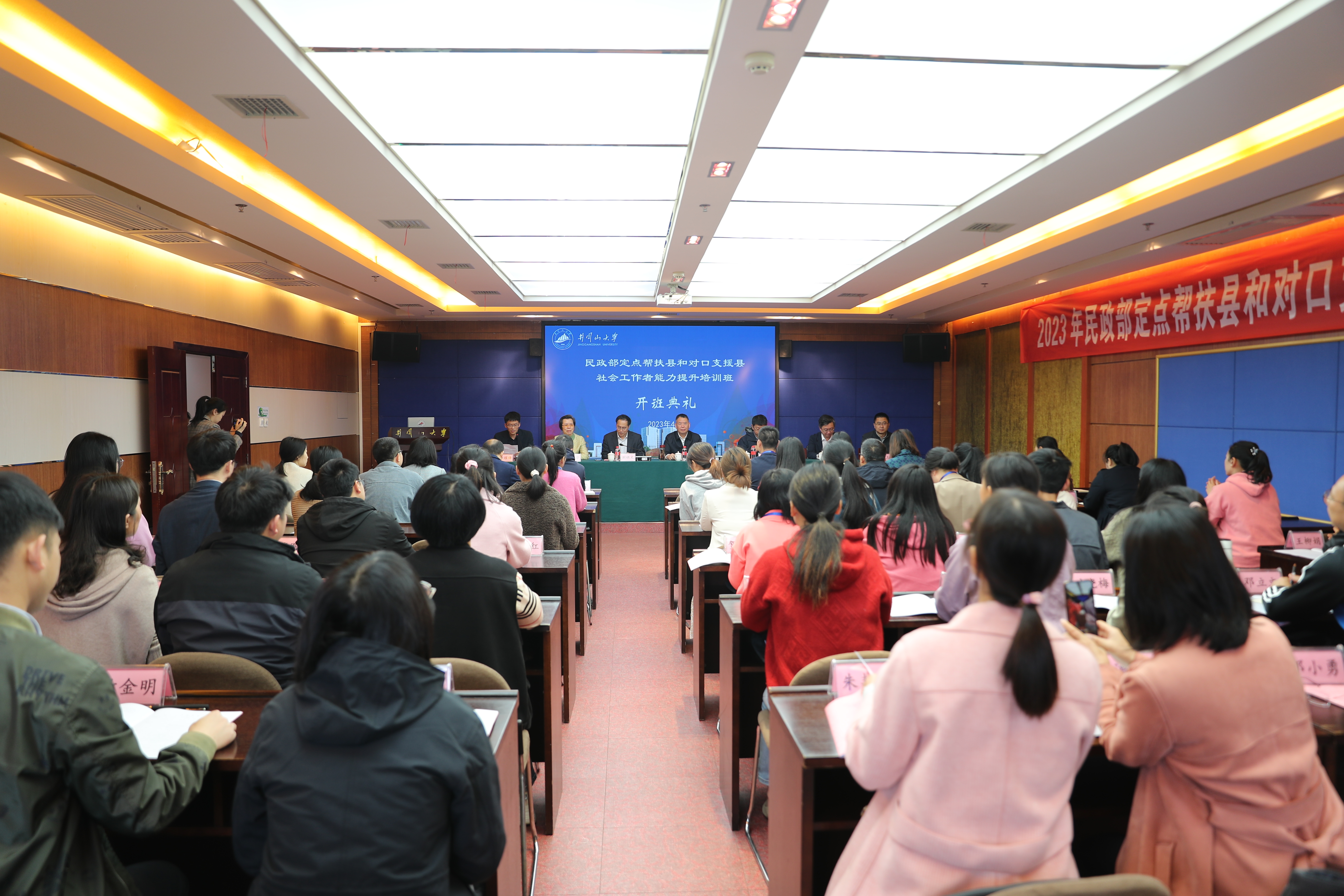 2023年4月24日上午,由井冈山大学国家社会工作专业人才培训基地、江西省哲学社会科学重点研究基地“井冈山大学社会工作与基层治理研究中心”承办的2023年民政部定点帮扶县和对口支援县社会工作者能力提升培训班在我校顺利召开。出席开班典礼的领导有民政部慈善事业促进和社会工作司社会工作处处长王铮键、江西省民政厅二级巡视员刘石呈、广东省民政厅慈善事业促进和社会工作处处长骆泽铭、江西省民政厅慈善事业促进和社会工作处处长邓丰华等,我校党委副书记刘祖文出席开班典礼并讲话。