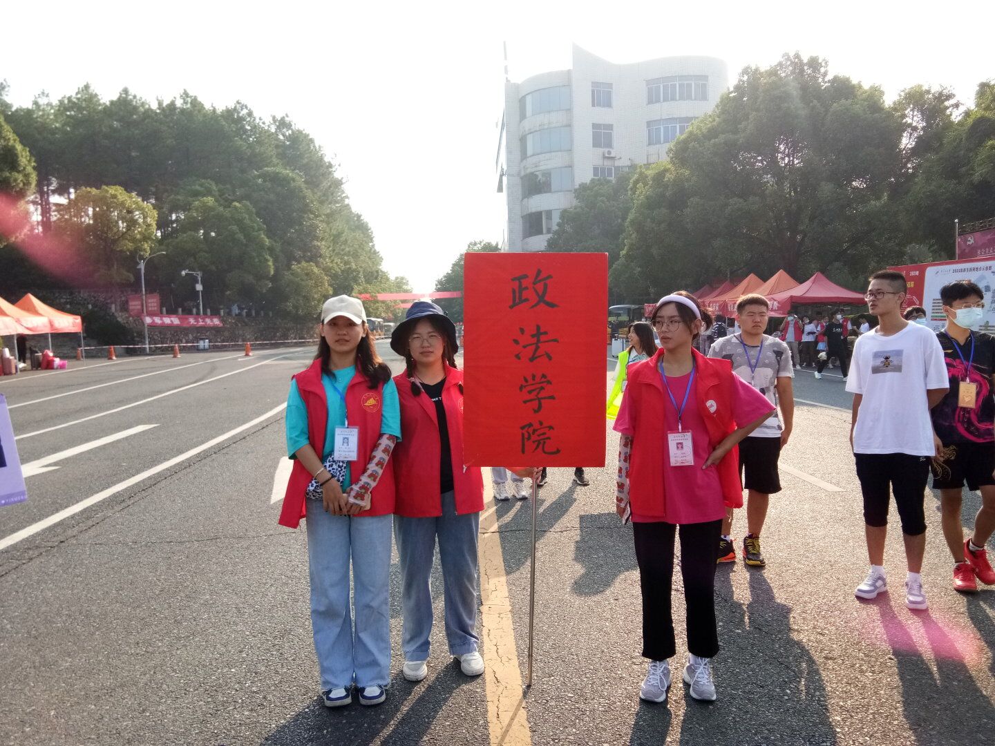 为迎接政法学院2021级新生、帮助其顺利入学,9月9日至10日,我院于学校西门和19栋楼下举行迎接新生活动,政法学院党委书记吴高平、院长仰和芝、党委副书记喻聪及各班班主任,来到报到点,与新生进行了亲切交流,并看望慰问了在场的工作人员、志愿者。
