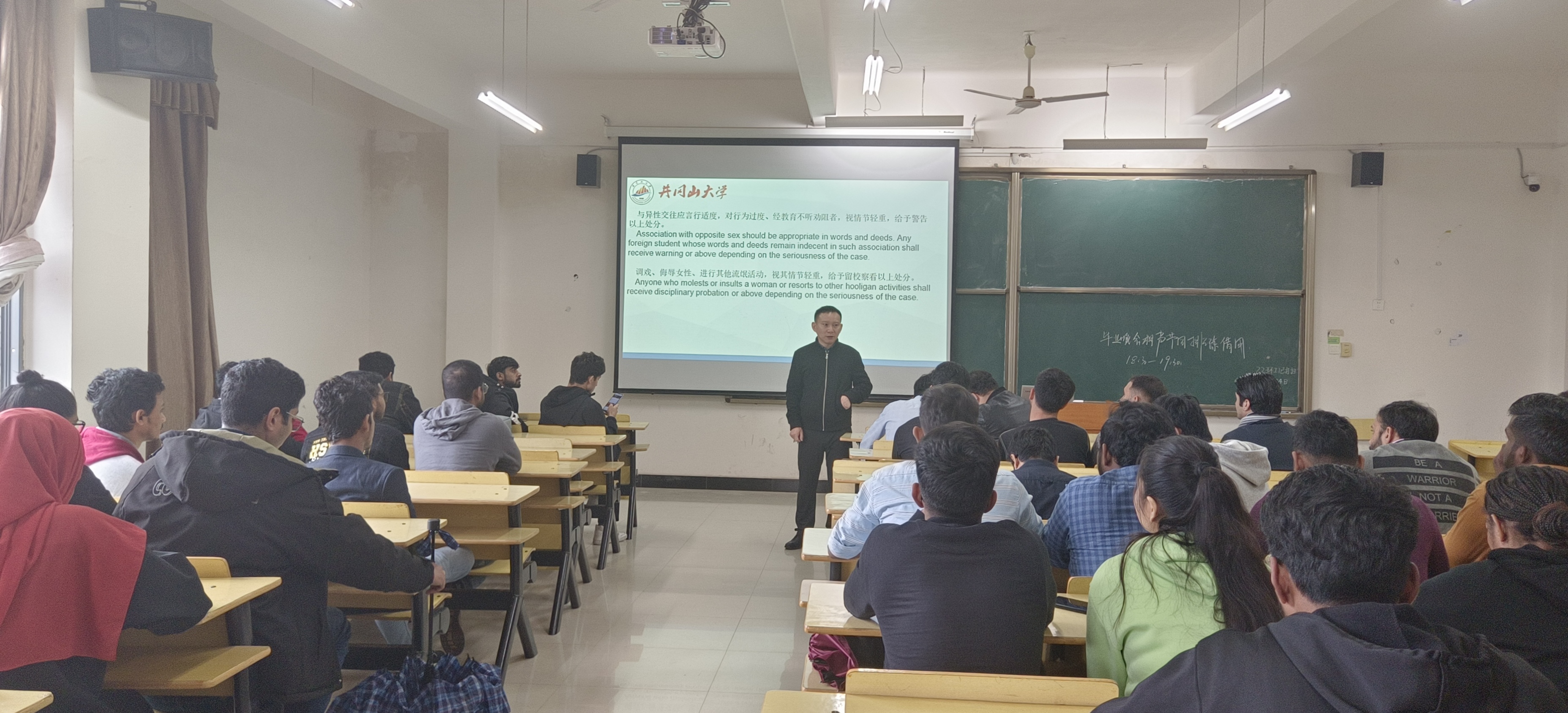 张长龙老师通过生动的案例,围绕外国人入境出境、“三非”治理、禁毒宣传、交通安全、宗教政策、留学生宿舍管理以及违纪处分等学校规章制度进行讲解,提醒留学生时刻遵守我国法律法规和学校规章制度,希望同学们强化法律安全意识,提高自我保护能力,筑牢平安留学安全防线。