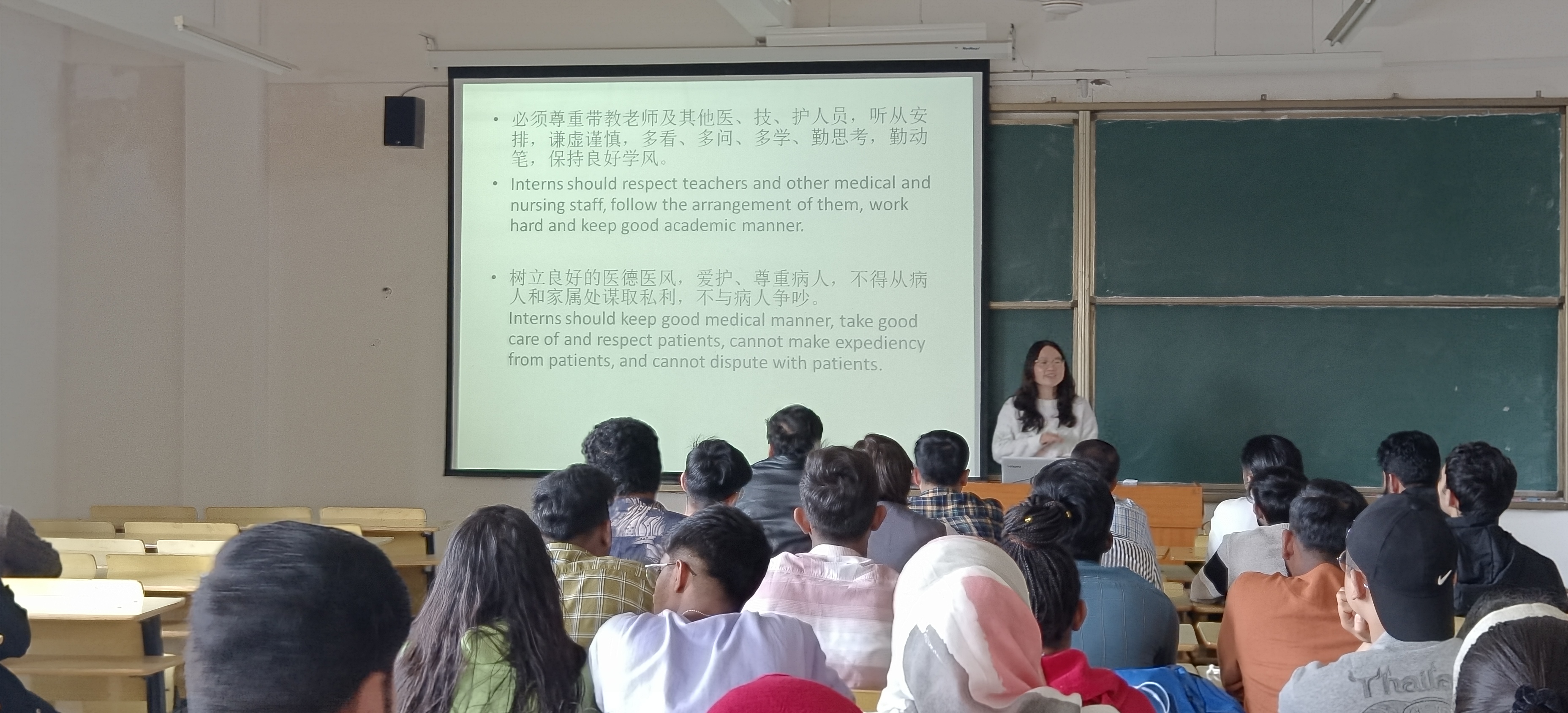 杨珍珍老师就实习期间的注意事项进行宣讲。她要求实习生必须严格遵守医院作息制度,上班不迟到、不早退;尊重带教老师和医护人员,服从安排、谦虚谨慎、勤奋好学;树立良好的医德医风,尊重爱护病人;严格遵守实习纪律和医院规章制度,离开吉安外出须经学校批准。通过三位老师细致生动的讲解,留学生有了高度重视实习期间安全、提高安全防范的深刻认识。(文/图:张长龙 审稿:刘雪昶、梁斌、苏小河)